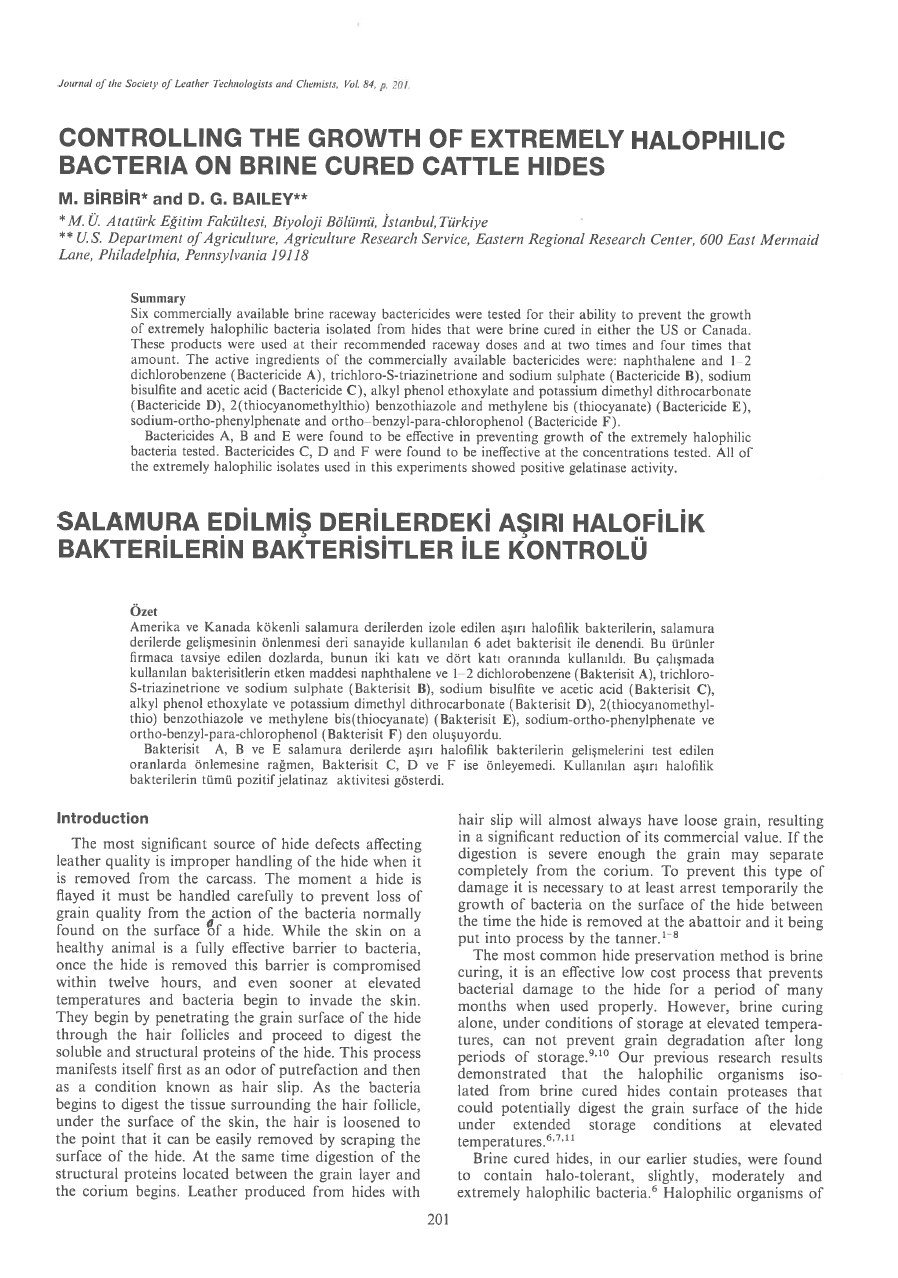 Six commercially available brine raceway bactericides were tested for their ability to prevent the growth of extremely halophilic bacteria isolated from hides that were brine cured in either the US or Canada. These products were used at their recommended raceway doses and at two times and four times that amount. The active ingredients of the commercially available bactericides were: naphthalene and 1-2 dichlorobenzene (Bactericide A), trichloro-S-triazinetrione and sodium sulphate (Bactericide B), sodium bisulfite and acetic acid (Bactericide C), alkyl phenol ethoxylate and potassium dimethyl dithrocarbonate (Bactericide D), 2(thiocyanomethylthio) benzothiazole and methylene bis (thiocyanate) (Bactericide E), sodium-ortho-phenylphenate and ortho- benzyl-para-chlorophenol (Bactericide F).