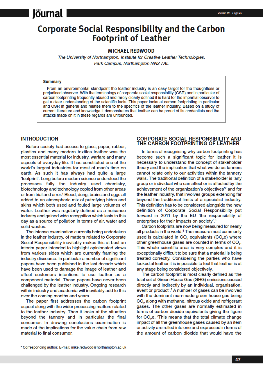 From an environmental standpoint the leather industry is an easy target for the thoughtless or prejudiced observer. With the terminology of corporate social responsibility (CSR) and in particular of carbon footprinting frequently abused and rarely clearly defined it is hard for the impartial observer to get a clear understanding of the scientific facts. This paper looks at carbon footprinting in particular and CSR in general and relates them to the specifics of the leather industry. Based on a study of current literature and knowledge it demonstrates that leather can be proud of its credentials and the attacks made on it in these regards are unfounded.