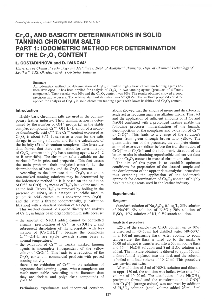 An iodometric method for determination of Cr2O3 in masked highly basic chromium tanning agents has been developed. It has been applied for analysis of Cr 203in two tanning agents (products of different companies). Their basicity was 50% and the Cr 203content was 30%. The results obtained showed a good precision and accuracy. The relative standard deviation was S 0.2%. The method proposed could be applied for analysis ofCr 203in solid chromium tanning agents with lower basicities and Cr2O3 content.
