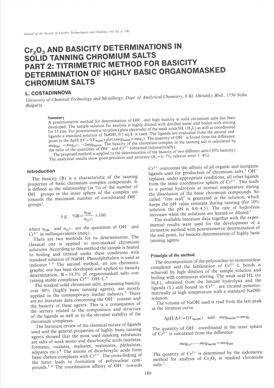 A potentiometric method for determination of OH and high basicity in solid chromium salts has been developed. The sample solution for analysis is highly diluted with distilled water and boiled with stirring for 15 mm. For potentiometric titration (glass electrode) of the weak acids HL(H2L) as well as coordinated ligands a standard solution of NaOH, 0.1 eq/L is used. The ligands are evaluated from the second endpoint in the ApH/zX V= f(VNaOH) plot (meqNH meq). The quantity of OH is found from the difference: meqo- =meq3±—2meq. The basicity of the chromium complex in the tanning salt is calculated by the ratio of the quantities of OH and Cr3 (obtained iodometrically). The proposed method is applied to the determination of the basicity of two different salts (50% basicity). The analytical results show good precision and accuracy (S1= 6—7%; relative error 1—4%).