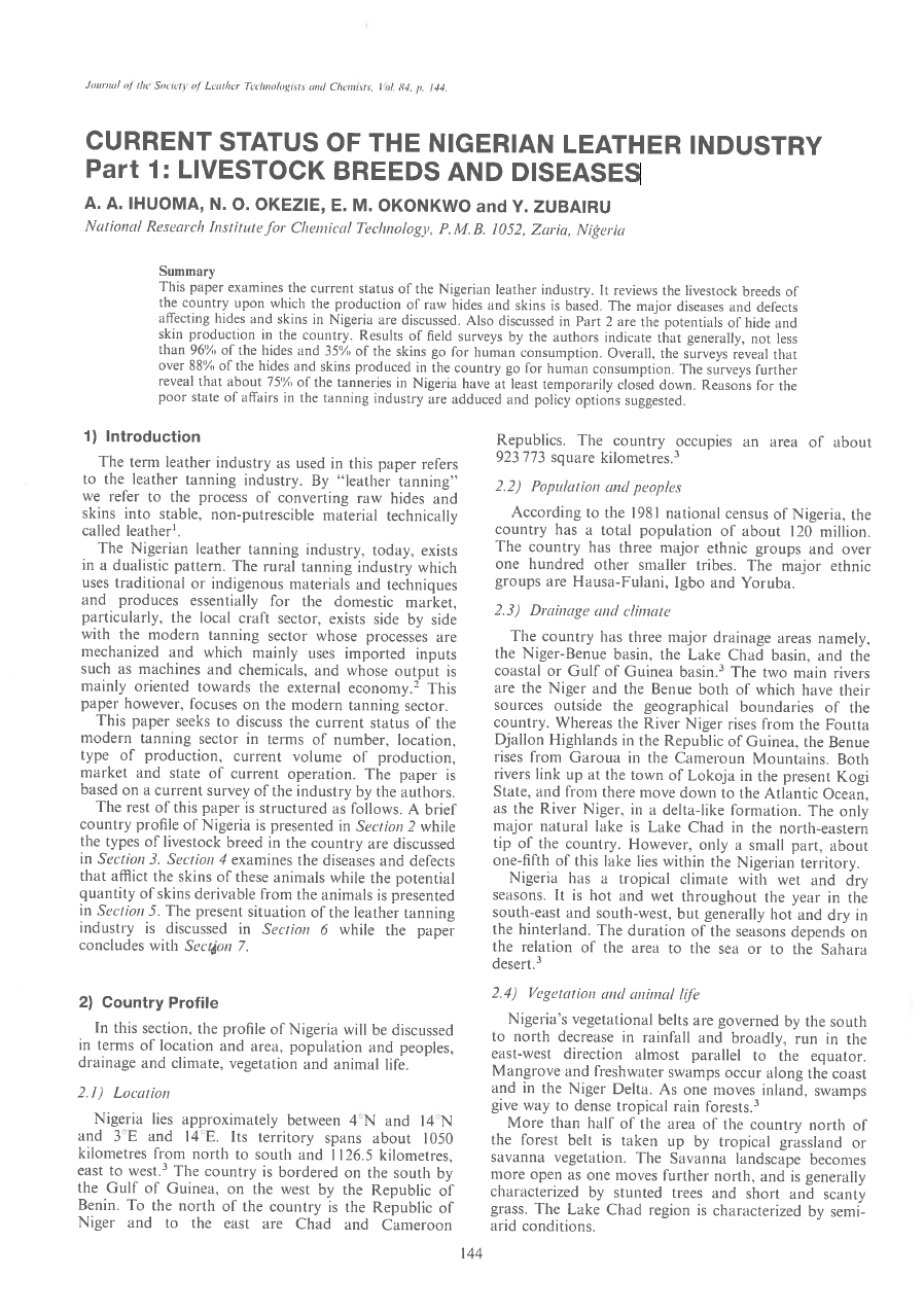 This paper examines the current status of the Nigerian leather industry. It reviews the livestock breeds of the country LLOfl which the production of raw hides and skins is based. The major diseases and defects affecting hides and skins in Nigeria are discussed. Also discussed in Part 2 are the potentials of hide and skin production in the country. Results of field surveys by the authors indicate that generally, not less than 964 of the hides and 35A of the skins go for human consumption. Overall, the surveys reveal that over 88% of the hides and skins produced in the country go for human consumption. The surveys further reveal that about 75% of the tanneries in Nigeria have at least temporarily closed down. Reasons for the poor state of affairs in the tanning industry are adduced and policy options suggested.