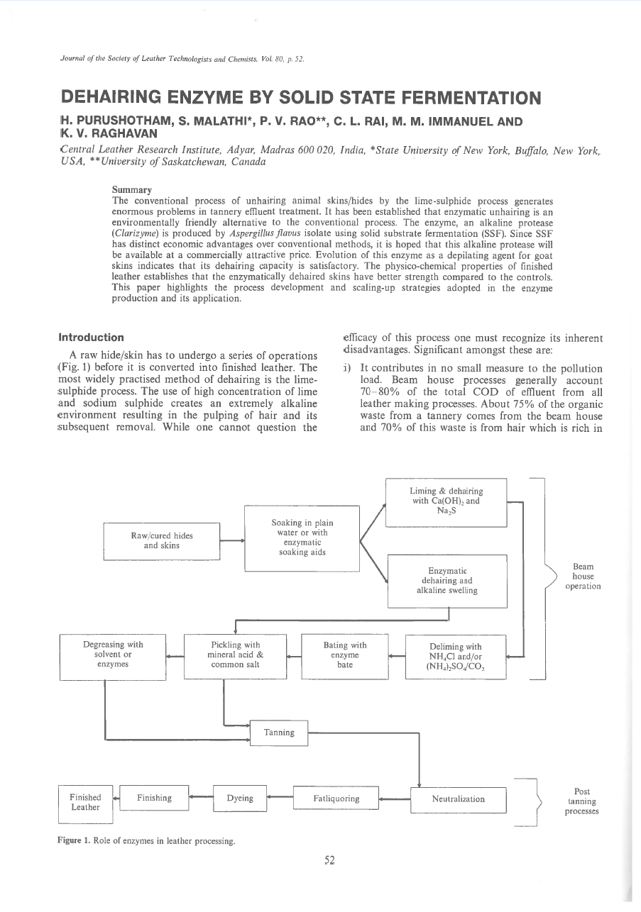 The conventional process of unhairing animal skins/hides by the lime-suiphide process generates enormous problems in tannery effluent treatment. It has been established that enzymatic unhairing is an environmentally friendly alternative to the conventional process. The enzyme, an alkaline protease (Clarizyme) is produced by Aspergillus flavus isolate using solid substrate fermentation (SSF). Since SSF has distinct economic advantages over conventional methods, it is hoped that this alkaline protease will be available at a commercially attractive price. Evolution of this enzyme as a depilating agent for goat skins indicates that its dehairing capacity is satisfactory. The physico-chemical properties of finished leather establishes that the enzymatically dehaired skins have better strength compared to the controls. This paper highlights the process development and scaling-up strategies adopted in the enzyme production and its application.