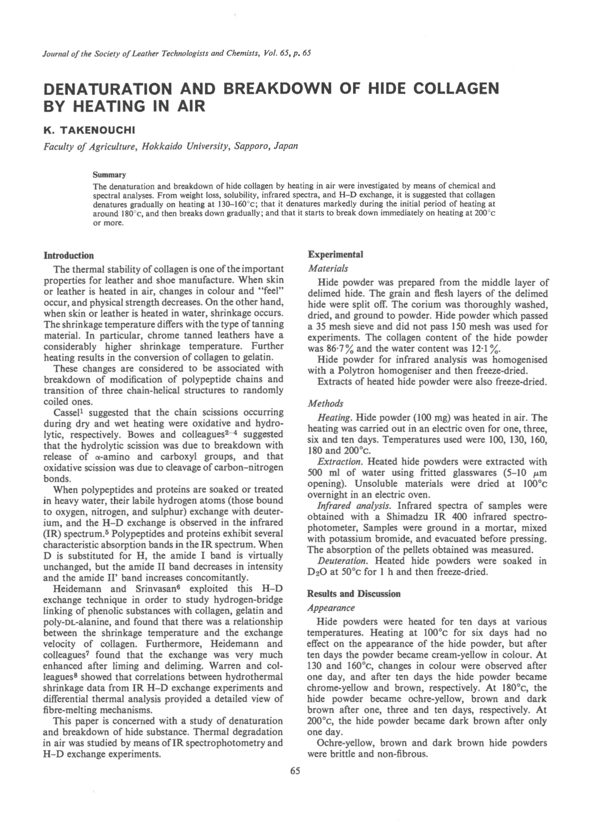 The denaturation and breakdown of hide collagen by heating in air were investigated by means of chemical and spectral analyses. From weight loss, solubility, infrared spectra, and H-D exchange, it is suggested that collagen denatures gradually on heating at 130-160°C; that it denatures markedly during the initial period of heating at around 180°C, and then breaks down gradually; and that it starts to break down immediately on heating at 200°C or more.