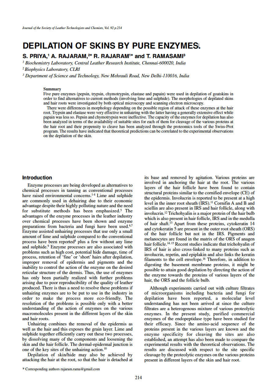 Five pure enzymes (pepsin, trypsin, chymotrypsin, elastase and papain) were used in depilation of goatskins in order to find alternatives to current methods (involving lime and sulphide). The morphologies of depilated skins and hair roots were investigated by both optical microscopy and scanning electron microscopy. There were differences in morphology depending on the possible region of attack of these enzymes at the hair root. Trypsin and elastase were very effective in unhairing with the latter having a generally extensive effect while papain was less so. Pepsin and chymotrypsin were ineffective. The capacity of the enzymes for depilation has also been analyzed in terms of the availability of suitable sites for each of them for cleavage of the various proteins at the hair root and their propensity to cleave has been analyzed through the proteomics tools of the Swiss-Prot program. The results have indicated that theoretical predictions can be correlated to the experimental observations on the depilation of the skin.