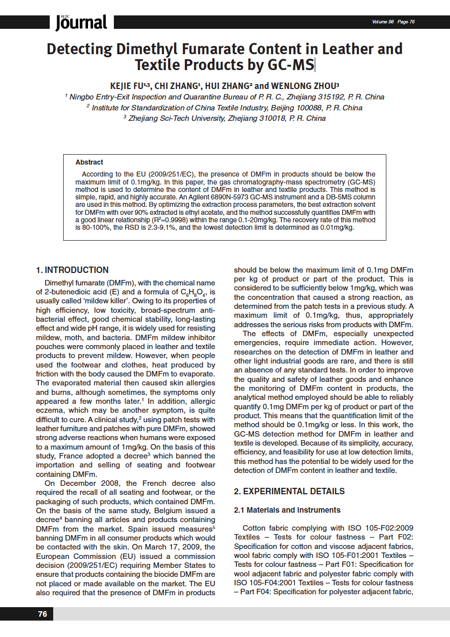 According to the EU (2009/251/EC), the presence of DMFm in products should be below the maximum limit of 0.1mg/kg. In this paper, the gas chromatography-mass spectrometry (GC-MS) method is used to determine the content of DMFm in leather and textile products. This method is simple, rapid, and highly accurate. An Agilent 6890N-5973 GC-MS instrument and a DB-5MS column are used in this method. By optimizing the extraction process parameters, the best extraction solvent for DMFm with over 90% extracted is ethyl acetate, and the method successfully quantifies DMFm with a good linear relationship (R2=0.9998) within the range 0.1-20mg/kg. The recovery rate of this method is 80-100%, the RSD is 2.3-9.1%, and the lowest detection limit is determined as 0.01mg/kg.