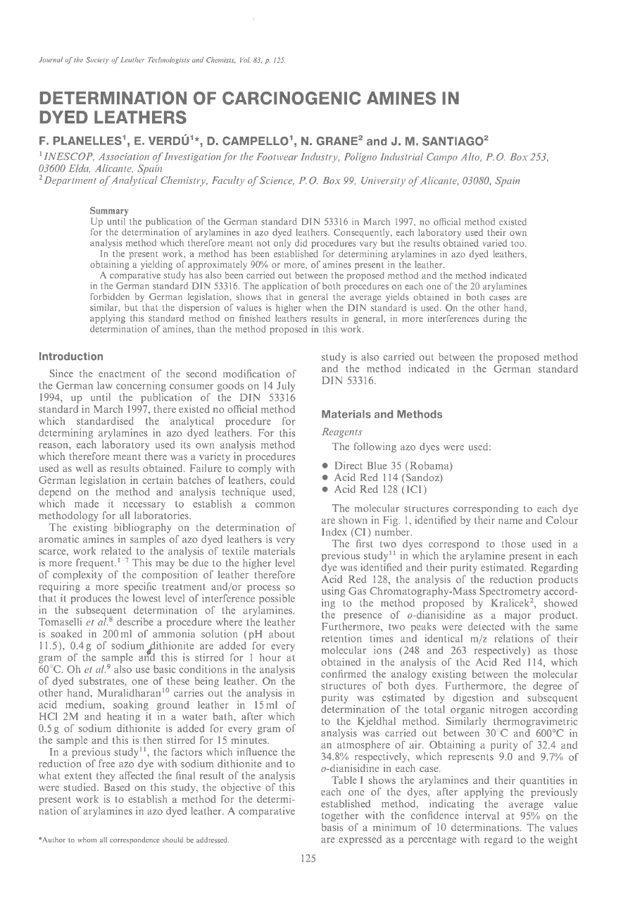 A comparative study has also been carried out between the proposed method and the method indicated in the German standard DIN 53316. The application of both procedures on each one of the 20 arylamines forbidden by German legislation, shows that in general the average yields obtained in both cases are similar, but that the dispersion of values is higher when the DIN standard is used. On the other hand, applying this standard method on finished leathers results in general, in more interferences during the determination of amines, than the method proposed in this work.
