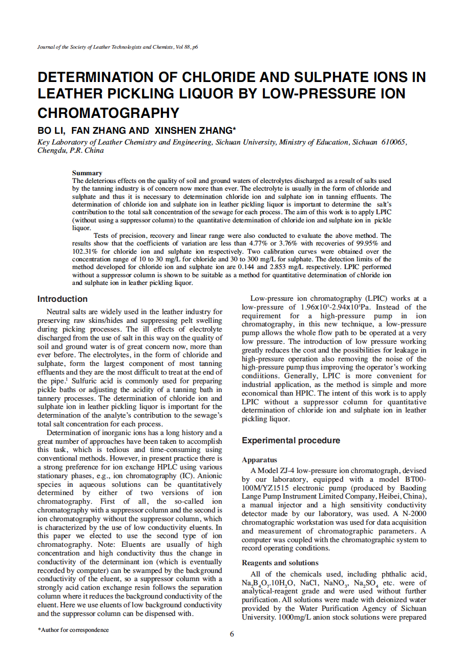 Tests of precision, recovery and linear range were also conducted to evaluate the above method. The results show that the coefficients of variation are less than 4.77% or 3.76% with recoveries of 99.95% and 102.31% for chloride ion and sulphate ion respectively. Two calibration curves were obtained over the concentration range of 10 to 30 mg/L for chloride and 30 to 300 mg/L for sulphate. The detection limits of the method developed for chloride ion and sulphate ion are 0.144 and 2.853 mg/L respectively. LPIC performed without a suppressor column is shown to be suitable as a method for quantitative determination of chloride ion and sulphate ion in leather pickling liquor.
