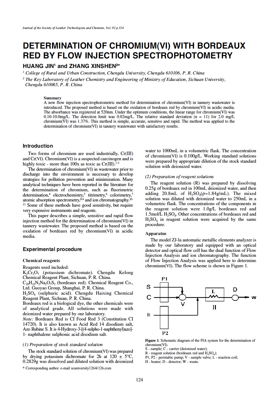 A new flow injection spectrophotometric method for determination of chromium(VI) in tannery wastewater is introduced. The proposed method is based on the oxidation of bordeaux red by chromium(VI) in acidic media. The absorbance was registered at 520nm. Under the optimum conditions, the linear range for chromium(VI) was 0.10-10.0mg/L. The detection limit was 0.02mg/L. The relative standard deviation (n = 11) for 2.0 mg/L chromium(VI) was 1.37%. This method is simple, accurate, sensitive and rapid. The method was applied to the determination of chromium(VI) in tannery wastewater with satisfactory results.