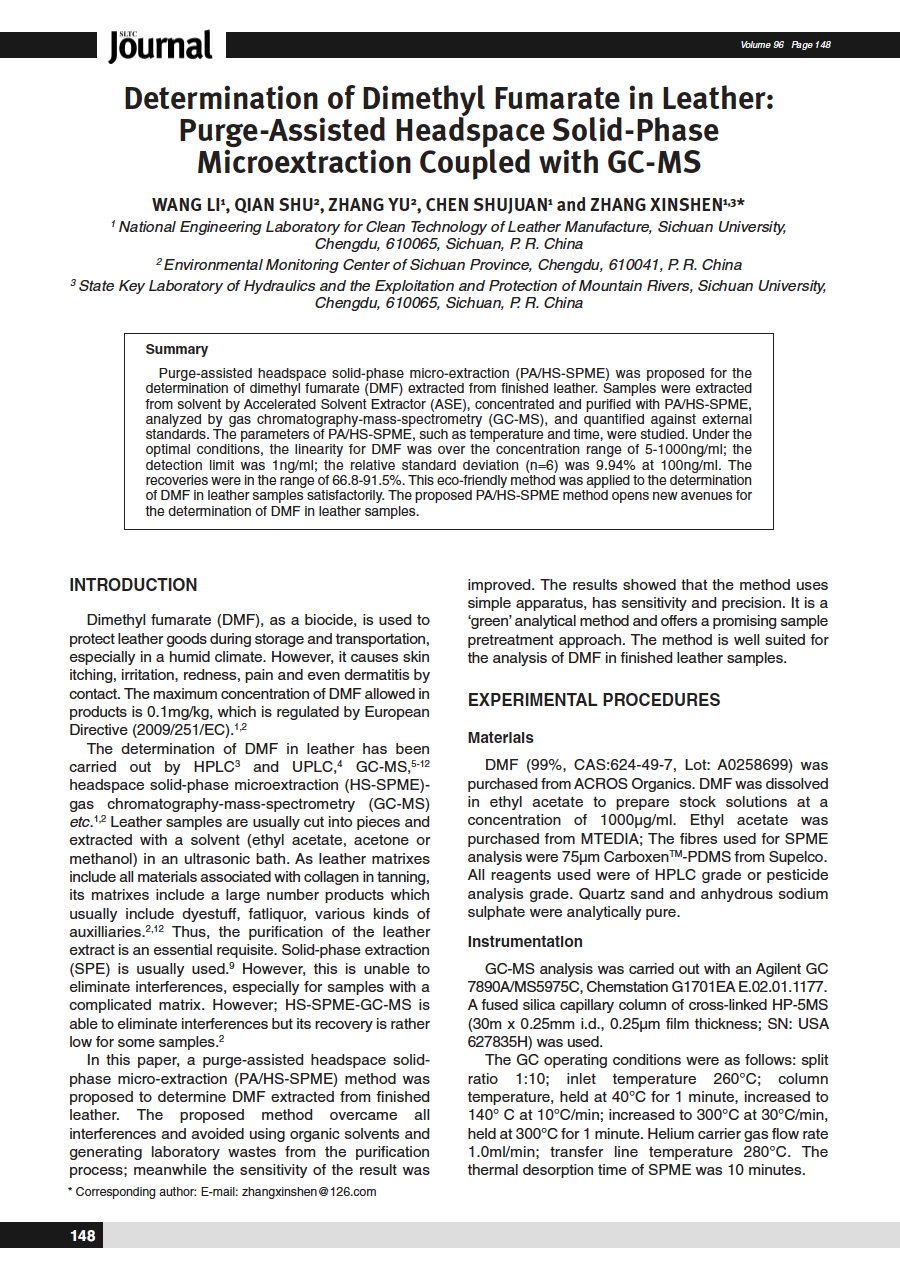 Determination of Dimethyl Fumarate in Leather: Purge-Assisted Headspace Solid-Phase Microextraction Coupled with GC-MS