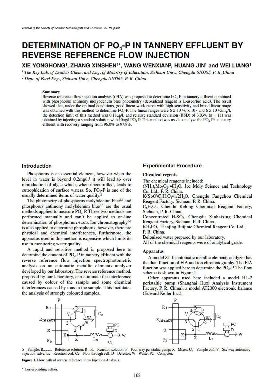 Reverse reference flow injection analysis (rFIA) was proposed to determine PO4-P in tannery effluent combined with phosphorus antimony molybdenum blue photometry (deoxidized reagent is L-ascorbic acid). The result showed that, under the optimal conditions, good linear work curve with high sensitivity and broad linear range was obtained with this method to determine PO4-P. The linear ranges were 6 x 10-4-6 x 10-2 and 6 x 10-2-5mg/l, the detection limit of this method was 0.18μg/l, and relative standard deviation (RSD) of 3.03% (n = 11) was obtained by injecting a standard solution with 10μg/l PO4-P. This method was used to analyze the PO4-P in tannery effluent with recovery ranging from 96.0% to 97.8%.