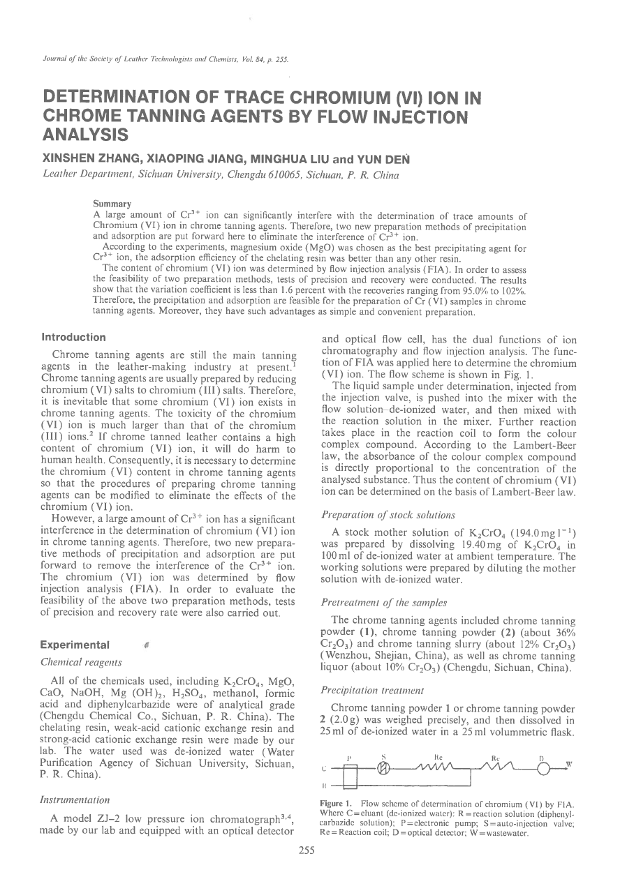 The content of chromium (VI) ion was determined by flow injection analysis (FIA). In order to assess the feasibility of two preparation methods, tests of precision and recovery were conducted. The results show that the variation coefficient is less than 1.6 percent with the recoveries ranging from 95.0% to 102%. Therefore, the precipitation and adsorption are feasible for the preparation of Cr (VI) samples in chrome tanning agents. Moreover, they have such advantages as simple and convenient preparation.