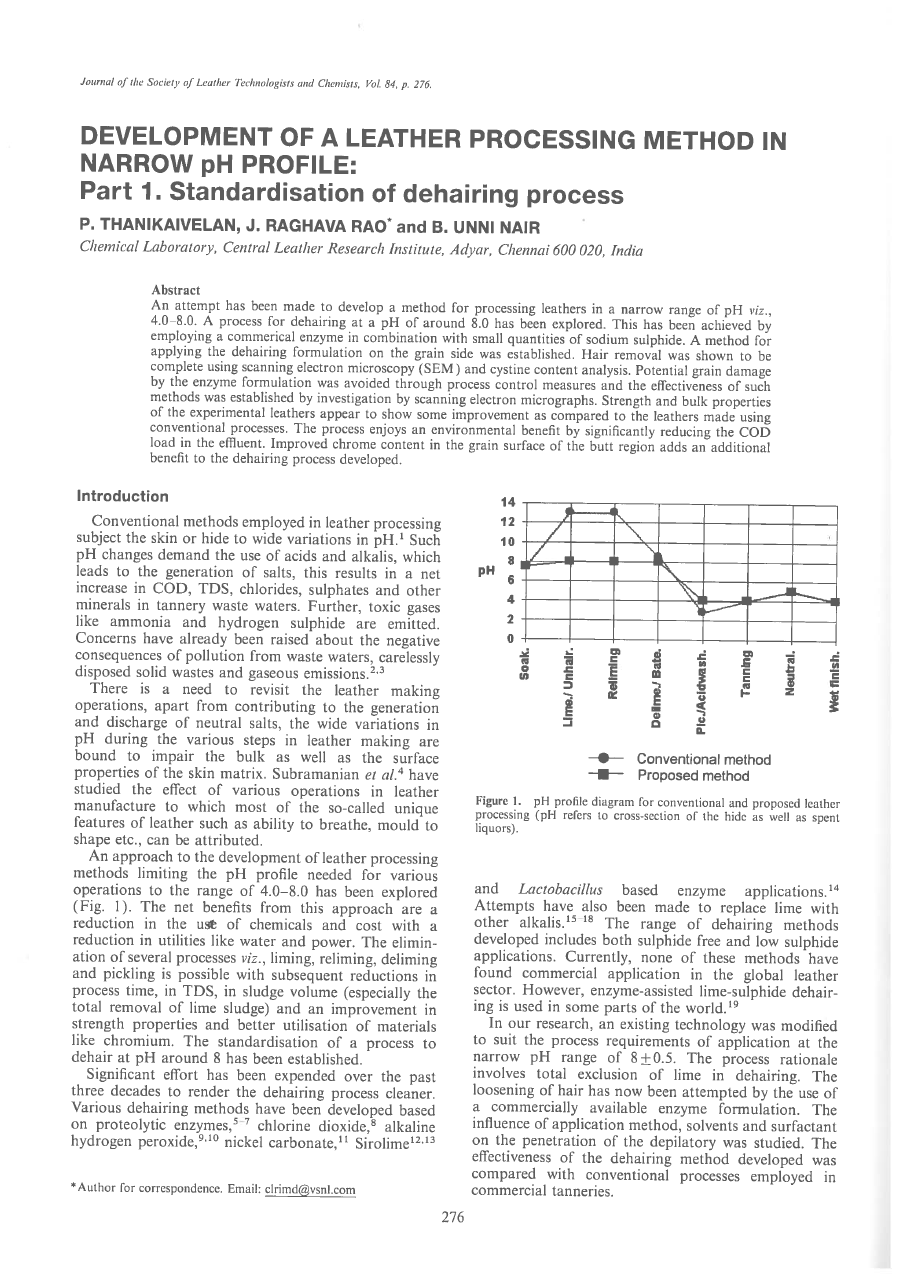 An attempt has been made to develop a method for processing leathers in a narrow range of pH viz., 4.0.8.0. A process for dehairing at a pH of around 8.0 has been explored. This has been achieved by employing a commerical enzyme in combination with small quantities of sodium suiphide. A method for applying the dehairing formulation on the grain side was established. Hair removal was shown to be complete using scanning electron microscopy (SEM) and cystine content analysis. Potential grain damage by the enzyme formulation was avoided through process control measures and the effectiveness of such methods was established by investigation by scanning electron micrographs. Strength and bulk properties of the experimental leathers appear to show some improvement as compared to the leathers made using conventional processes. The process enjoys an environmental benefit by significantly reducing the COD load in the effluent. Improved chrome content in the grain surface of the butt region adds an additional benefit to the dehairing process developed.