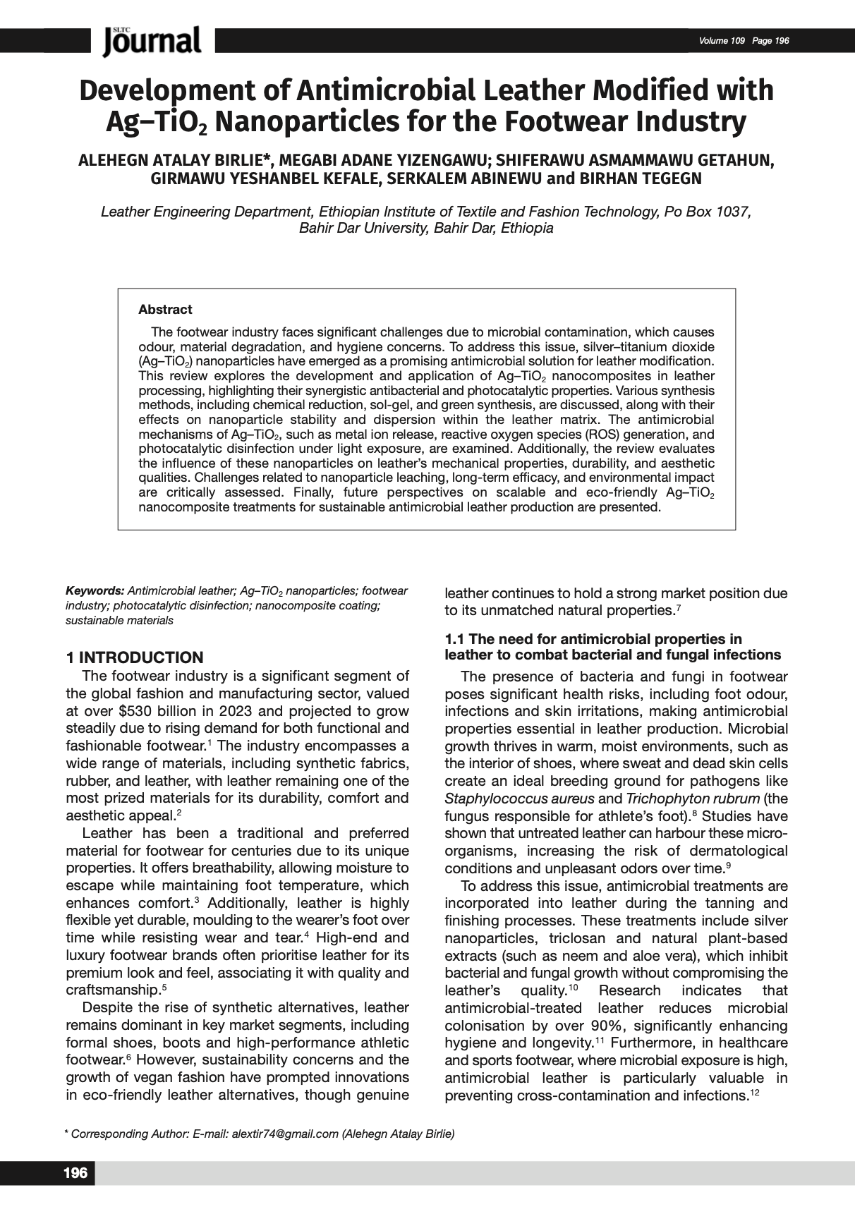 The footwear industry faces significant challenges due to microbial contamination, which causes odour, material degradation, and hygiene concerns. To address this issue, silver–titanium dioxide (Ag–TiO₂) nanoparticles have emerged as a promising antimicrobial solution for leather modification. This review explores the development and application of Ag–TiO₂ nanocomposites in leather processing, highlighting their synergistic antibacterial and photocatalytic properties. Various synthesis methods, including chemical reduction, sol-gel, and green synthesis, are discussed, along with their effects on nanoparticle stability and dispersion within the leather matrix. The antimicrobial mechanisms of Ag–TiO₂, such as metal ion release, reactive oxygen species (ROS) generation, and photocatalytic disinfection under light exposure, are examined. Additionally, the review evaluates the influence of these nanoparticles on leather’s mechanical properties, durability, and aesthetic qualities. Challenges related to nanoparticle leaching, long-term efficacy, and environmental impact are critically assessed. Finally, future perspectives on scalable and eco-friendly Ag–TiO₂ nanocomposite treatments for sustainable antimicrobial leather production are presented.