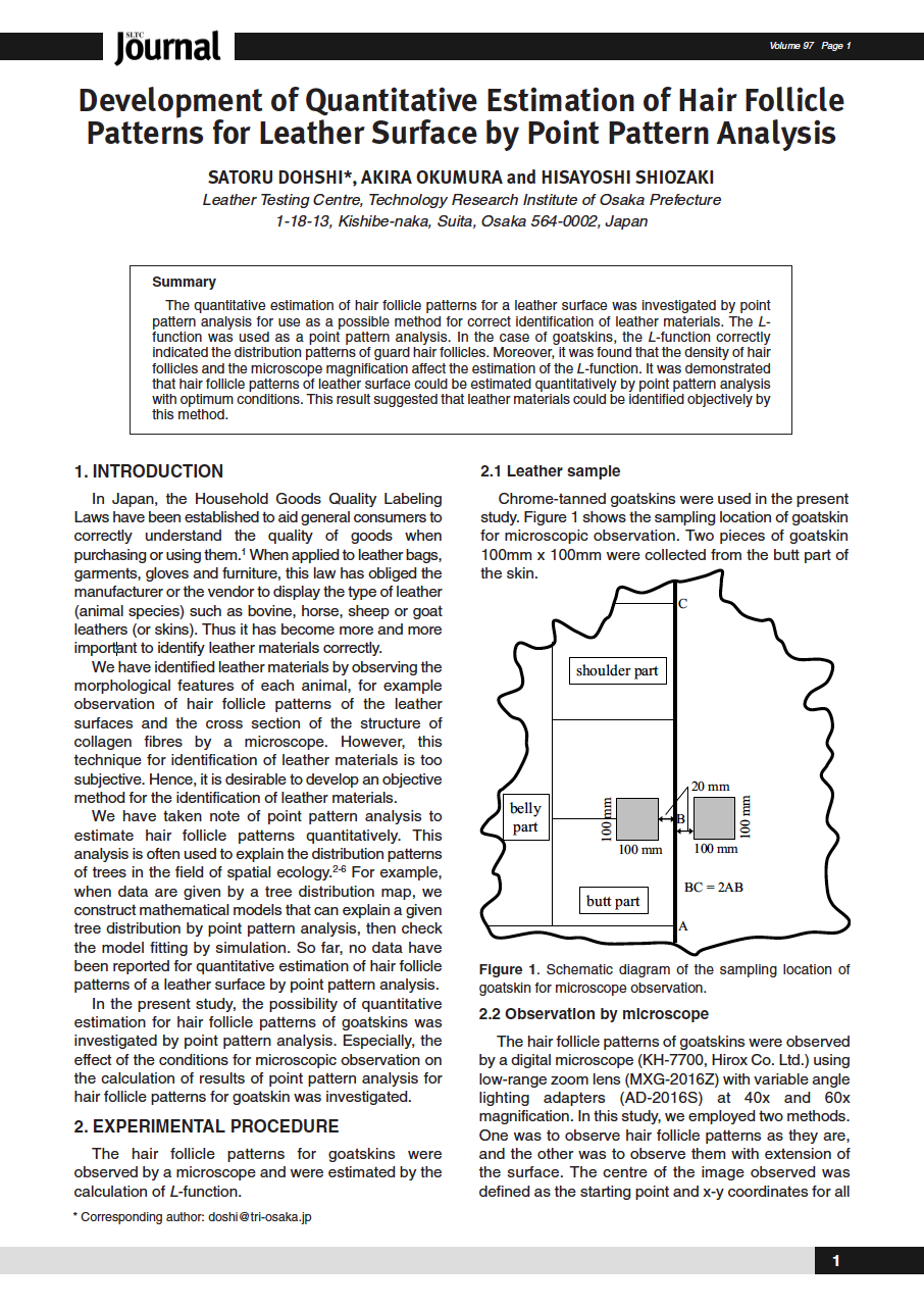 The quantitative estimation of hair follicle patterns for a leather surface was investigated by point pattern analysis for use as a possible method for correct identification of leather materials. The Lfunction was used as a point pattern analysis. In the case of goatskins, the L-function correctly indicated the distribution patterns of guard hair follicles. Moreover, it was found that the density of hair follicles and the microscope magnification affect the estimation of the L-function. It was demonstrated that hair follicle patterns of leather surface could be estimated quantitatively by point pattern analysis with optimum conditions. This result suggested that leather materials could be identified objectively by this method.