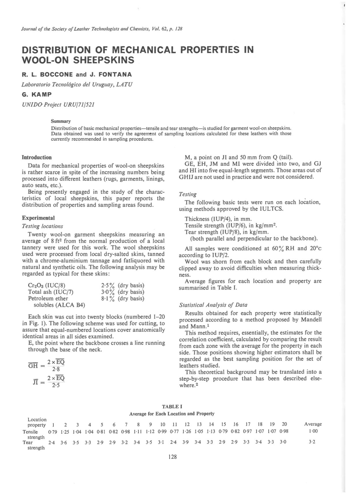 Distribution of basic mechanical properties – tensile and tear strengths – is studied for garment wool-on sheepskins. Data obtained was used to verify the agreement of sampling locations calculated for these leathers with those currently recommended in sampling procedures.