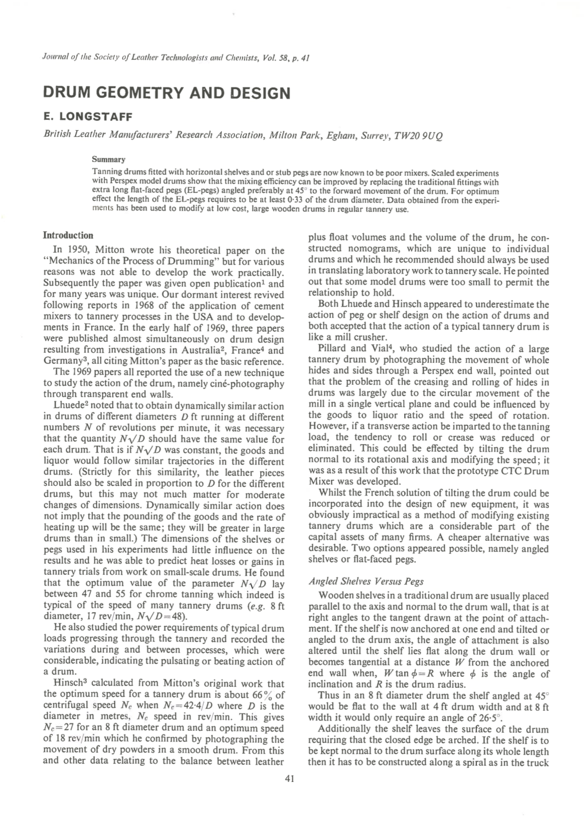 Tanning drums fitted with horizontal shelves and or stub pegs are now known to be poor mixers. Scaled experiments with Perspex model drums show that the mixing efficiency can be improved by replacing the traditional fittings with extra long flat-faced pegs (EL-pegs) angled preferably at 45° to the forward movement of the drum. For optimum effect the length of the EL-pegs requires to be at least 0.33 of the drum diameter. Data obtained from the experiments has been used to modify at low cost, large wooden drums in regular tannery use.