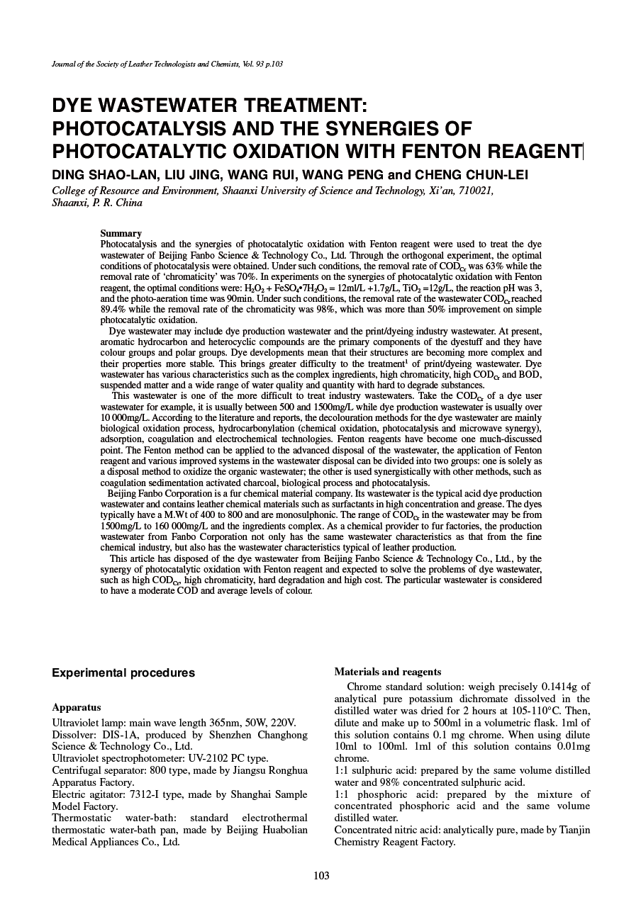 This wastewater is one of the more difficult to treat industry wastewaters. Take the CODCr of a dye user wastewater for example, it is usually between 500 and 1500mg/L while dye production wastewater is usually over 10 000mg/L. According to the literature and reports, the decolouration methods for the dye wastewater are mainly biological oxidation process, hydrocarbonylation (chemical oxidation, photocatalysis and microwave synergy), adsorption, coagulation and electrochemical technologies. Fenton reagents have become one much-discussed point. The Fenton method can be applied to the advanced disposal of the wastewater, the application of Fenton reagent and various improved systems in the wastewater disposal can be divided into two groups: one is solely as a disposal method to oxidize the organic wastewater; the other is used synergistically with other methods, such as coagulation sedimentation activated charcoal, biological process and photocatalysis.