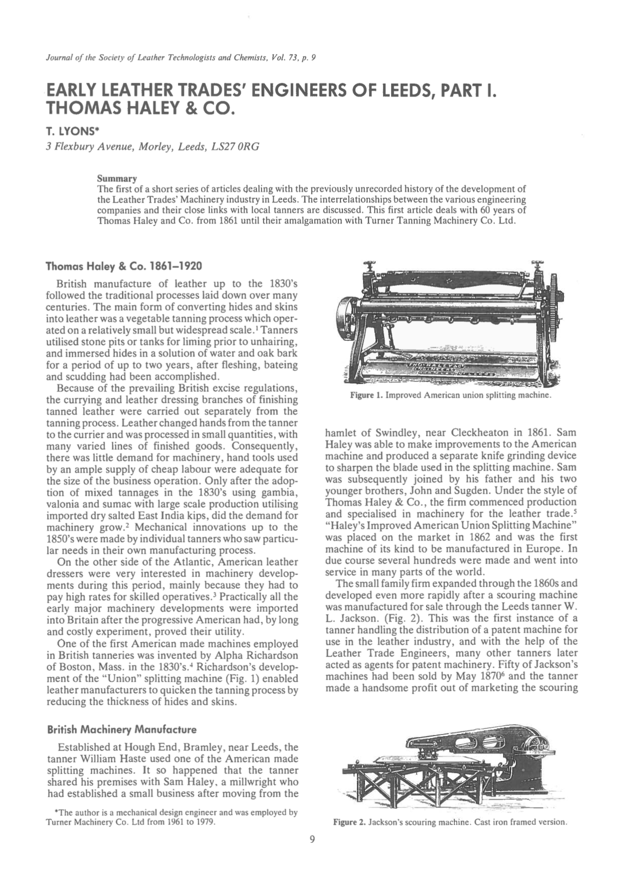 The first of a short series of articles dealing with the previously unrecorded history of the development of the Leather Trades’ Machinery industry in Leeds. The interrelationships between the various engineering companies and their close links with local tanners are discussed. This first article deals with 60 years of Thomas Haley and Co. from 1861 until their amalgamation with Turner Tanning Machinery Co. Ltd.