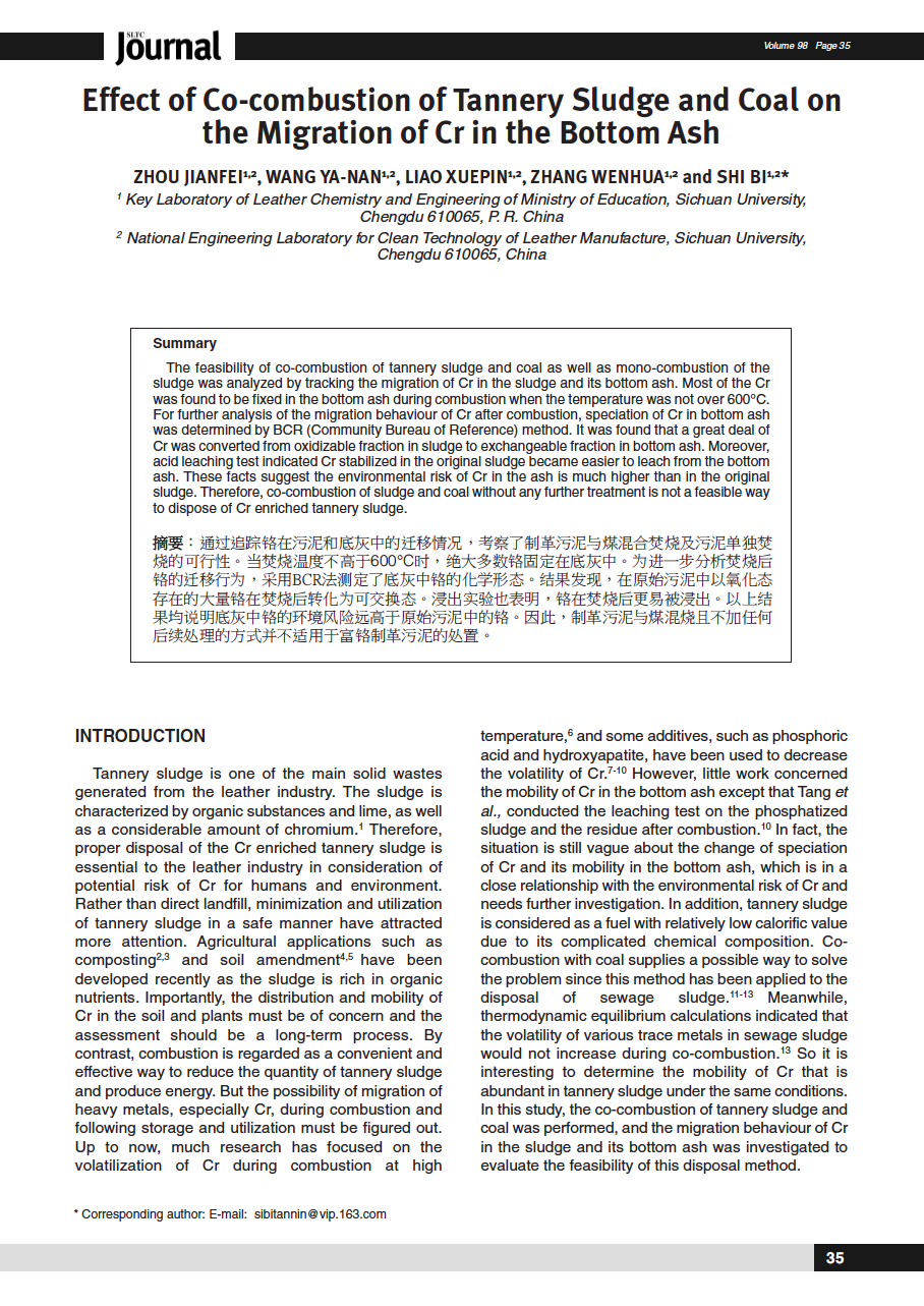 Effect of Co-combustion of Tannery Sludge and Coal on the Migration of Cr in the Bottom Ash