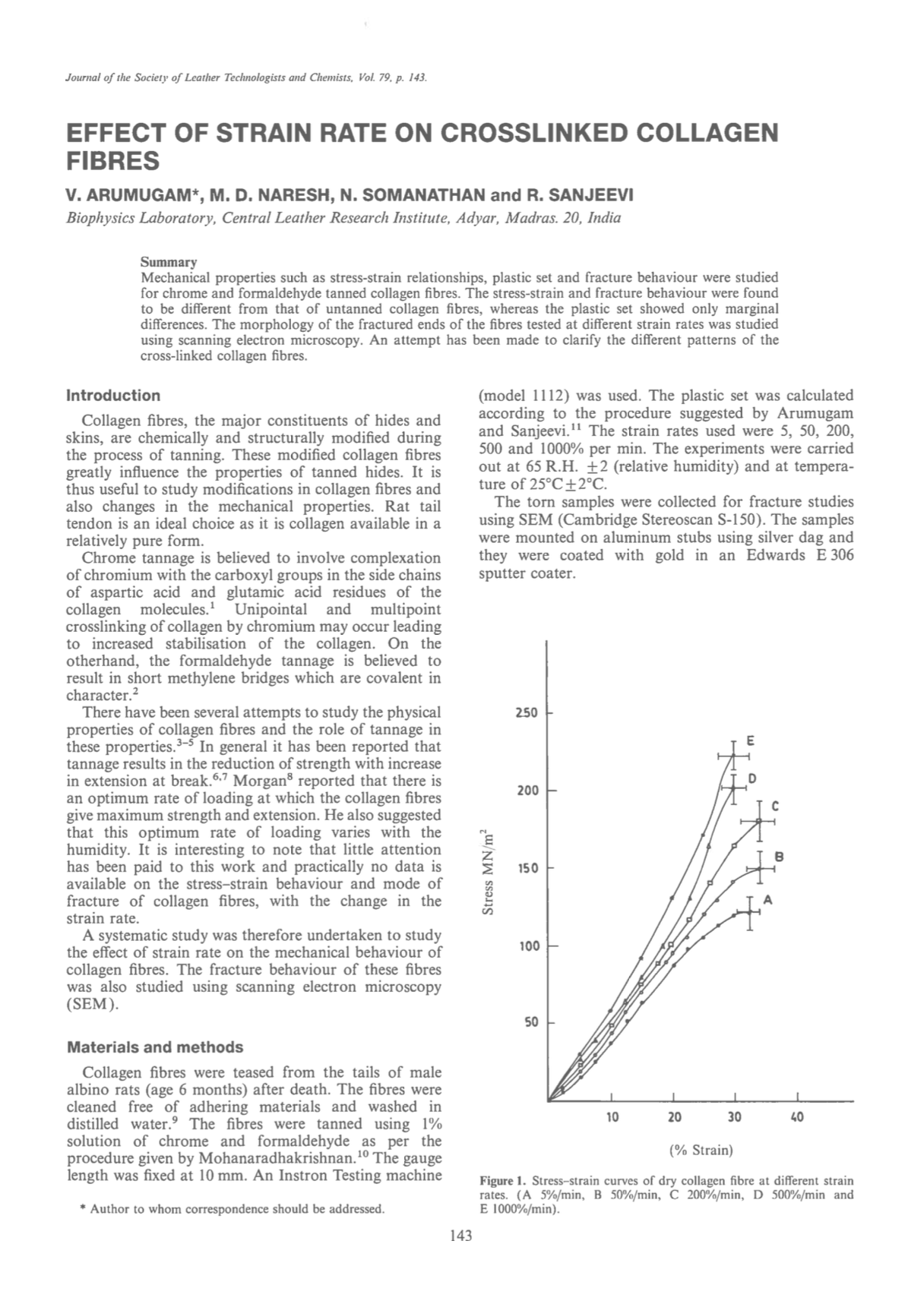 Mechanical properties such as stress-strain relationships, plastic set and fracture behaviour were studied for chrome and formaldehyde tanned collagen fibres. The stress-strain and fracture behaviour were found to be different from that of untanned collagen fibres, whereas the plastic set showed only marginal differences. The morphology of the fractured ends of the fibres tested at different strain rates was studied using scanning electron microscopy. An attempt has been made to clarify the different patterns of the cross-linked collagen fibres.