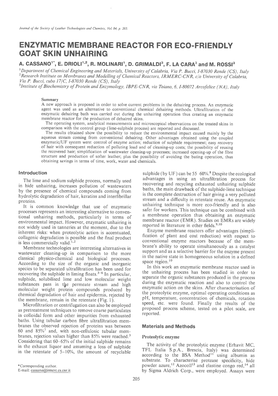 The results obtained show the possibility to reduce the environmental impact caused mainly by the aqueous stream coming from conventional dehairing. Other advantages obtained using the coupled enzymatic/UF system were: control of enzyme action; reduction of sulphide requirement: easy recovery of hair with consequent reduction of polluting load and of cleaning-up costs; the possibility of reusing the recovered hair; simplification of wastewater cleaning-up processes: increased opening-up of the fibre structure and production of softer leather; plus the possibility of avoiding the bating operation, thus obtaining savings in terms of time, work, water and chemicals.