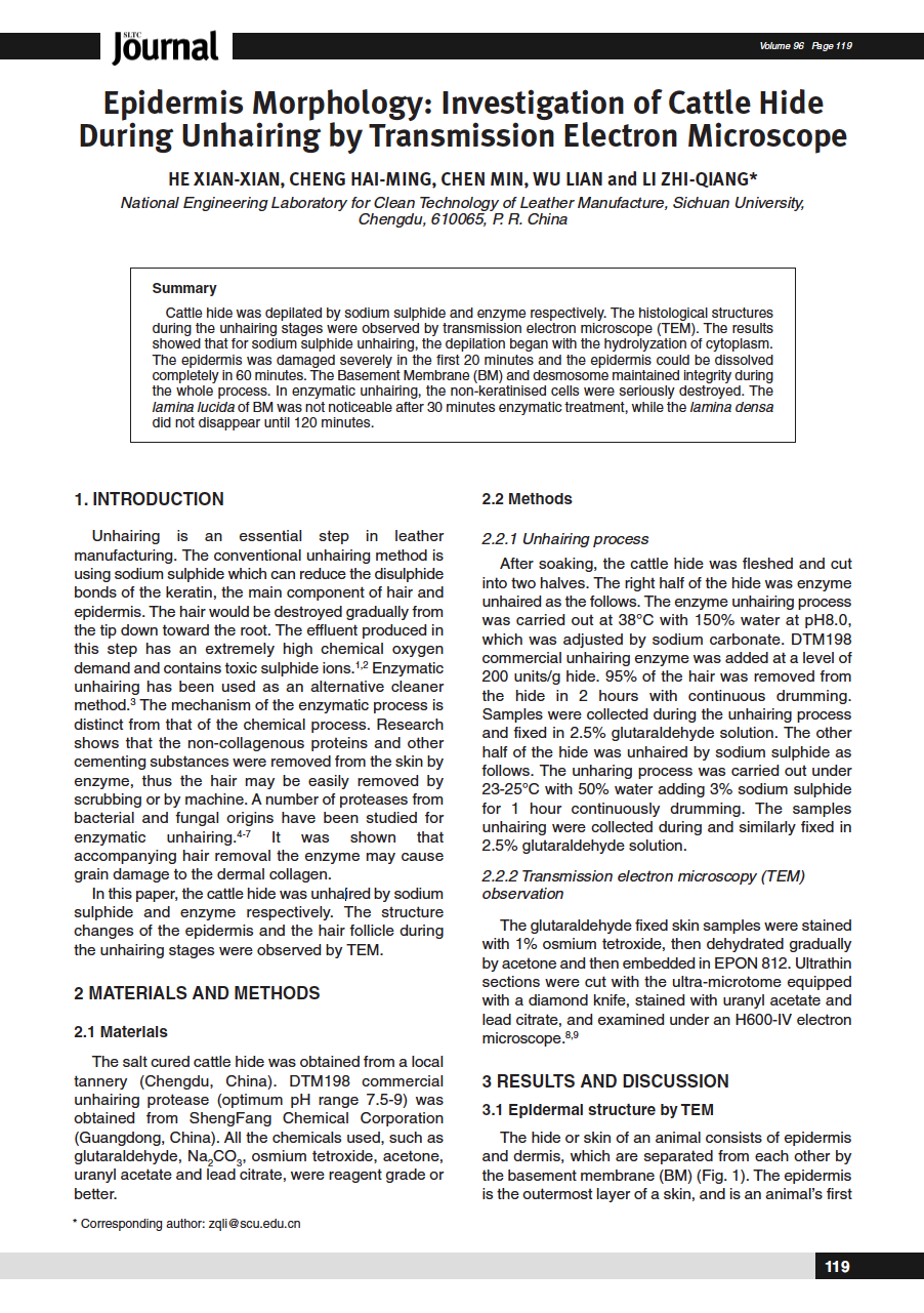 Cattle hide was depilated by sodium sulphide and enzyme respectively. The histological structures during the unhairing stages were observed by transmission electron microscope (TEM). The results showed that for sodium sulphide unhairing, the depilation began with the hydrolyzation of cytoplasm. The epidermis was damaged severely in the first 20 minutes and the epidermis could be dissolved completely in 60 minutes. The Basement Membrane (BM) and desmosome maintained integrity during the whole process. In enzymatic unhairing, the non-keratinised cells were seriously destroyed. The lamina lucida of BM was not noticeable after 30 minutes enzymatic treatment, while the lamina densa did not disappear until 120 minutes.