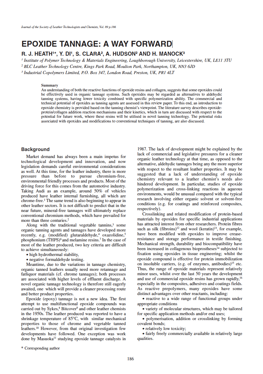 An understanding of both the reactive functions of epoxide resins and collagen, suggests that some epoxides could be effectively used in organic tannage systems. Such epoxides may be regarded as alternatives to aldehydic tanning systems, having lower toxicity combined with specific polymerization ability. The commercial and technical potential of epoxides as tanning agents are assessed in this review paper. To this end, an introduction to epoxide chemistry is provided based on the tanning chemist’s viewpoint. The literature survey describes epoxideprotein/ collagen addition reaction mechanisms and their kinetics, which in turn are discussed with respect to the potential for future work, where these resins will be utilised in novel tanning technology. The potential risks associated with epoxides and modifications to conventional techniques of tanning, are also discussed.