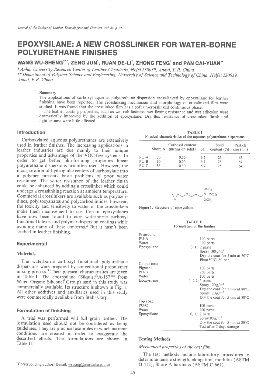 The applications of carboxyl aqueous polyurethane dispersion cross-linked by epoxysilane for leather finishing have been reported. The crosslinking mechanism and morphology of crosslinked film were studied. It was found that the crosslinked film has a soft un-crosslinked continuous phase.