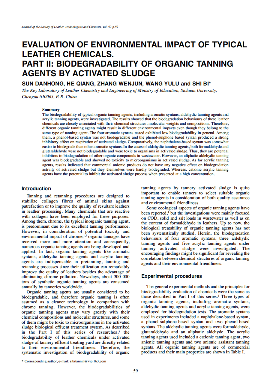 The biodegradability of typical organic tanning agents, including aromatic syntans, aldehydic tanning agents and acrylic tanning agents, were investigated. The results showed that the biodegradation behaviours of these leather chemicals are closely associated with their chemical structures, molecular weights and compositions. Therefore, different organic tanning agents might result in different environmental impacts even though they belong to the same type of tanning agent. The four aromatic syntans tested exhibited low biodegradability in general. Among them, a phenol-based syntan was not biodegradable and the phenol-sulphone based syntan produced a strong inhibitory effect on respiration of activated sludge. Comparatively, the naphthalene-based syntan was somewhat easier to biodegrade than other aromatic syntans. In the cases of aldehydic tanning agents, both formaldehyde and glutaraldehyde were not biodegradable and were toxic to organisms in activated sludge. Thus, they are potential inhibitors to biodegradation of other organic compounds in wastewater. However, an aliphatic aldehydic tanning agent was biodegradable and showed no toxicity to microorganisms in activated sludge. As for acrylic tanning agents, results indicated that commercial anionic products do not have any negative effect on biodegradation activity of activated sludge but they themselves were hardly biodegraded. Whereas, cationic acrylic tanning agents have the potential to inhibit the activated sludge process when presented at a high concentration.