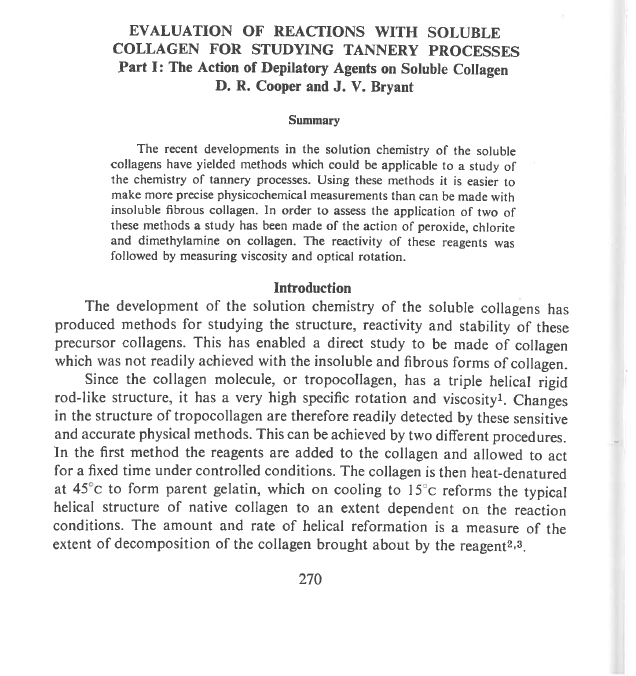 The recent developments in the solution chemistry of the soluble collagens have yielded methods which could be applicable to a study of the chemistry of tannery processes. Using these methods it is easier to make more precise physicochemical measurements than can be made with insoluble fibrous collagen. In order to assess the application of two of these methods a study has been made of the action of peroxide, chlorite and dimethylamine on collagen. The reactivity of these reagents was followed by measuring viscosity and optical rotation.