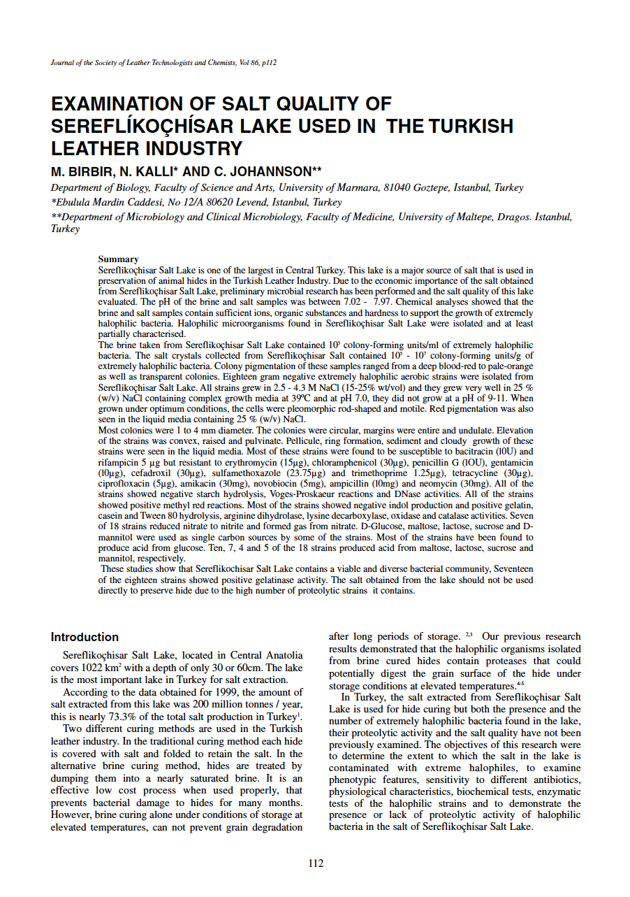 Sereflikoçhisar Salt Lake is one of the largest in Central Turkey. This lake is a major source of salt that is used in preservation of animal hides in the Turkish Leather Industry. Due to the economic importance of the salt obtained from Sereflikoçhisar Salt Lake, preliminary microbial research has been performed and the salt quality of this lake evaluated. The pH of the brine and salt samples was between 7.02 – 7.97. Chemical analyses showed that the brine and salt samples contain sufficient ions, organic substances and hardness to support the growth of extremely halophilic bacteria. Halophilic microorganisms found in Sereflikoçhisar Salt Lake were isolated and at least partially characterised.