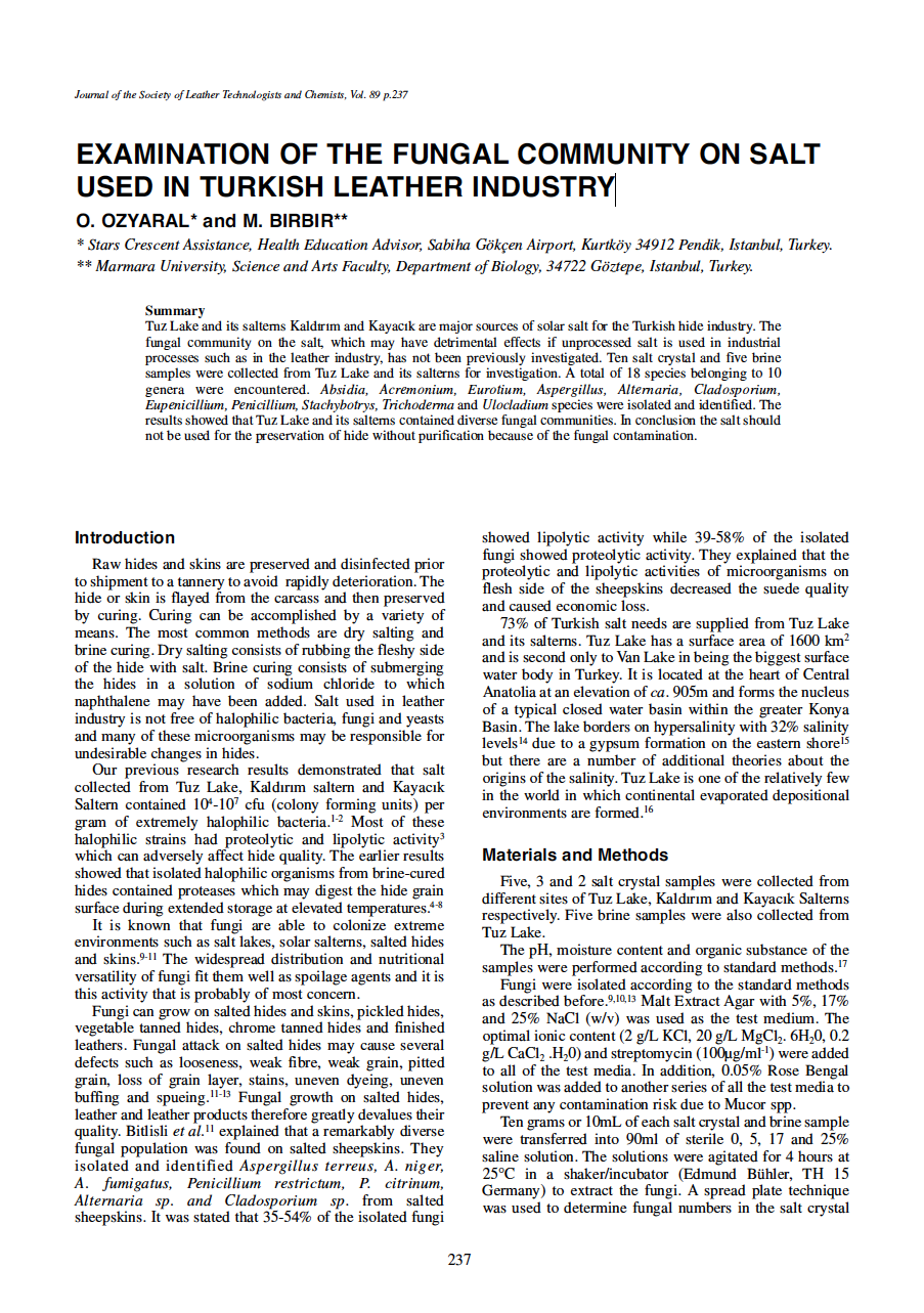 Tuz Lake and its salterns Kaldırım and Kayacık are major sources of solar salt for the Turkish hide industry. The fungal community on the salt, which may have detrimental effects if unprocessed salt is used in industrial processes such as in the leather industry, has not been previously investigated. Ten salt crystal and five brine samples were collected from Tuz Lake and its salterns for investigation. A total of 18 species belonging to 10 genera were encountered. Absidia, Acremonium, Eurotium, Aspergillus, Alternaria, Cladosporium, Eupenicillium, Penicillium, Stachybotrys, Trichoderma and Ulocladium species were isolated and identified. The results showed that Tuz Lake and its salterns contained diverse fungal communities. In conclusion the salt should not be used for the preservation of hide without purification because of the fungal contamination.