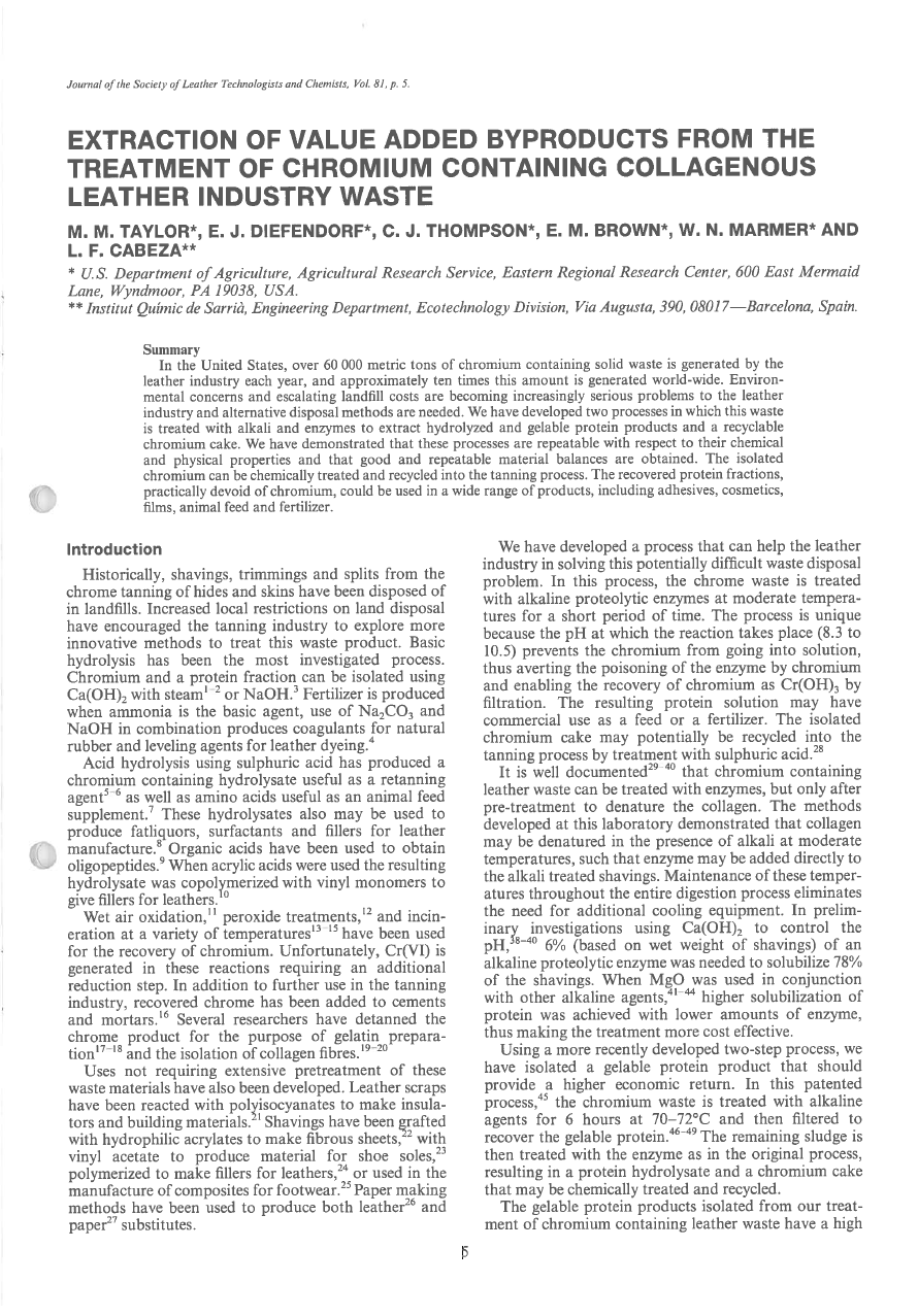 In the United States, over 60 000 metric tons of chromium containing solid waste is generated by the leather industry each year, and approximately ten times this amount is generated world-wide. Environ mental concerns and escalating landfill costs are becoming increasingly serious problems to the leather industry and alternative disposal methods are needed. We have developed two processes in which this waste is treated with alkali and enzymes to extract hydrolyzed and gelable protein products and a recyclable chromium cake. We have demonstrated that these processes are repeatable with respect to their chemical and physical properties and that good and repeatable material balances are obtained. The isolated chromium can be chemically treated and recycled into the tanning process. The recovered protein fractions, practically devoid of chromium, could be used in a wide range of products, including adhesives, cosmetics, films, animal feed and fertilizer.