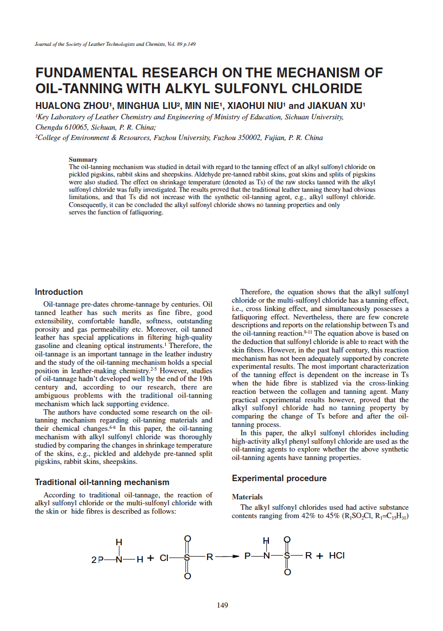 The oil-tanning mechanism was studied in detail with regard to the tanning effect of an alkyl sulfonyl chloride on pickled pigskins, rabbit skins and sheepskins. Aldehyde pre-tanned rabbit skins, goat skins and splits of pigskins were also studied. The effect on shrinkage temperature (denoted as Ts) of the raw stocks tanned with the alkyl sulfonyl chloride was fully investigated. The results proved that the traditional leather tanning theory had obvious limitations, and that Ts did not increase with the synthetic oil-tanning agent, e.g., alkyl sulfonyl chloride. Consequently, it can be concluded the alkyl sulfonyl chloride shows no tanning properties and only serves the function of fatliquoring.