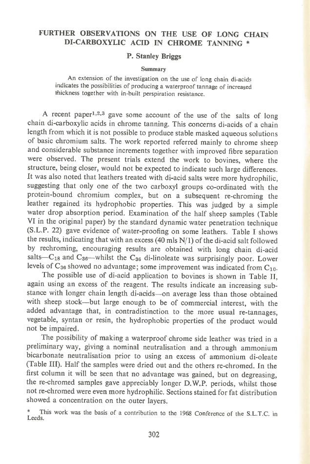 An extension of the investigation on the use of long chain di-acids shows that it is possible to produce a waterproof tannage with increased thickness and built-in perspiration resistance.