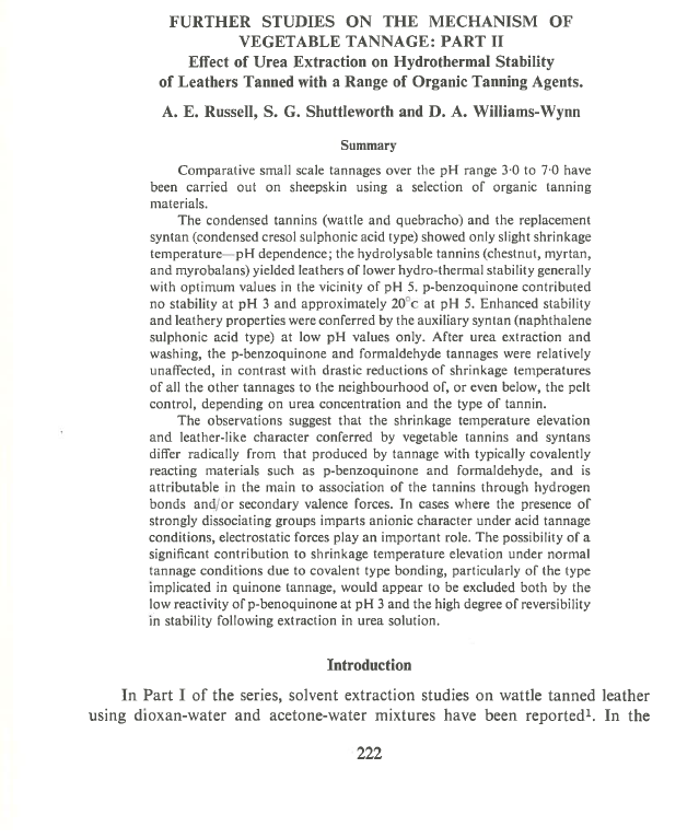 The condensed tannins (wattle and quebracho) and the replacement syntan (condensed cresol sulphonic acid type) showed only slight shrinkage temperature—pH dependence; the hydrolysable tannins (chestnut, myrtan, and myrobalans) yielded leathers of lower hydro-thermal stability generally with optimum values in the vicinity of pH 5. p-benzoquinone contributed no stability at pH 3 and approximately 20°c at pH 5. Enhanced stability and leathery properties were conferred by the auxiliary syntan (naphthalene sulphonic acid type) at low pH values only. After urea extraction and washing, the p-benzoquinone and formaldehyde tannages were relatively unaffected, in contrast with drastic reductions of shrinkage temperatures of all the other tannages to the neighbourhood of, or even below, the pelt control, depending on urea concentration and the type of tannin.