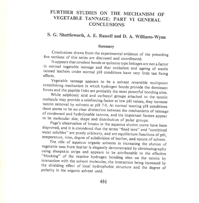 he role of aqueous organic solvents in increasing the elution of vegetable tans from leather is elegantly demonstrated by chromatography using sheepskin strips and appears to be attributable to the effective “blocking” of the reactive hydrogen bonding sites on the tannin by interaction with the solvent molecules, the interaction being increased by the shielding effect of local hydrophobic structure and the degree of polarity in the organic solvent used.