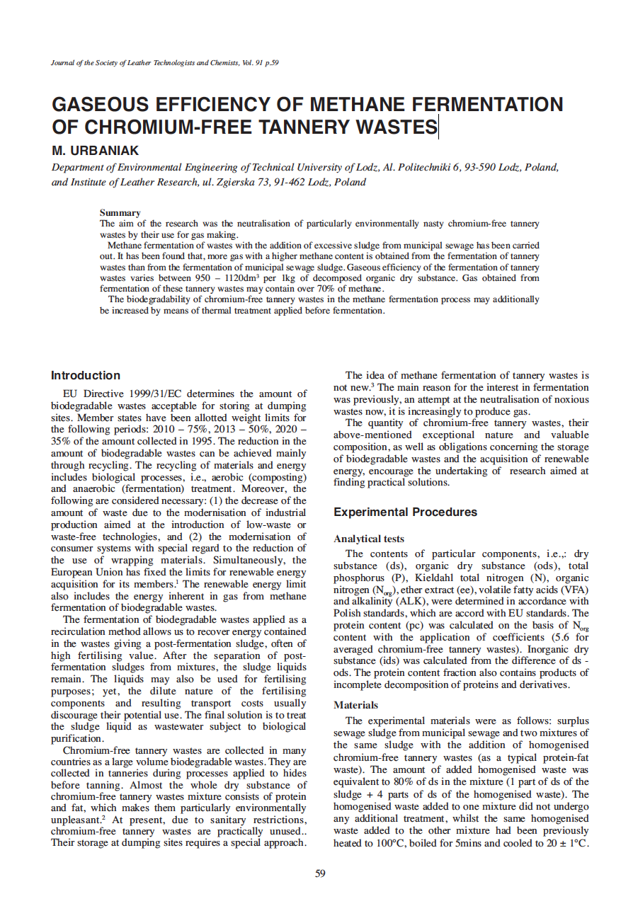 Gaseous Efficiency Of Methane Fermentation Of Chromium-Free Tannery Wastes