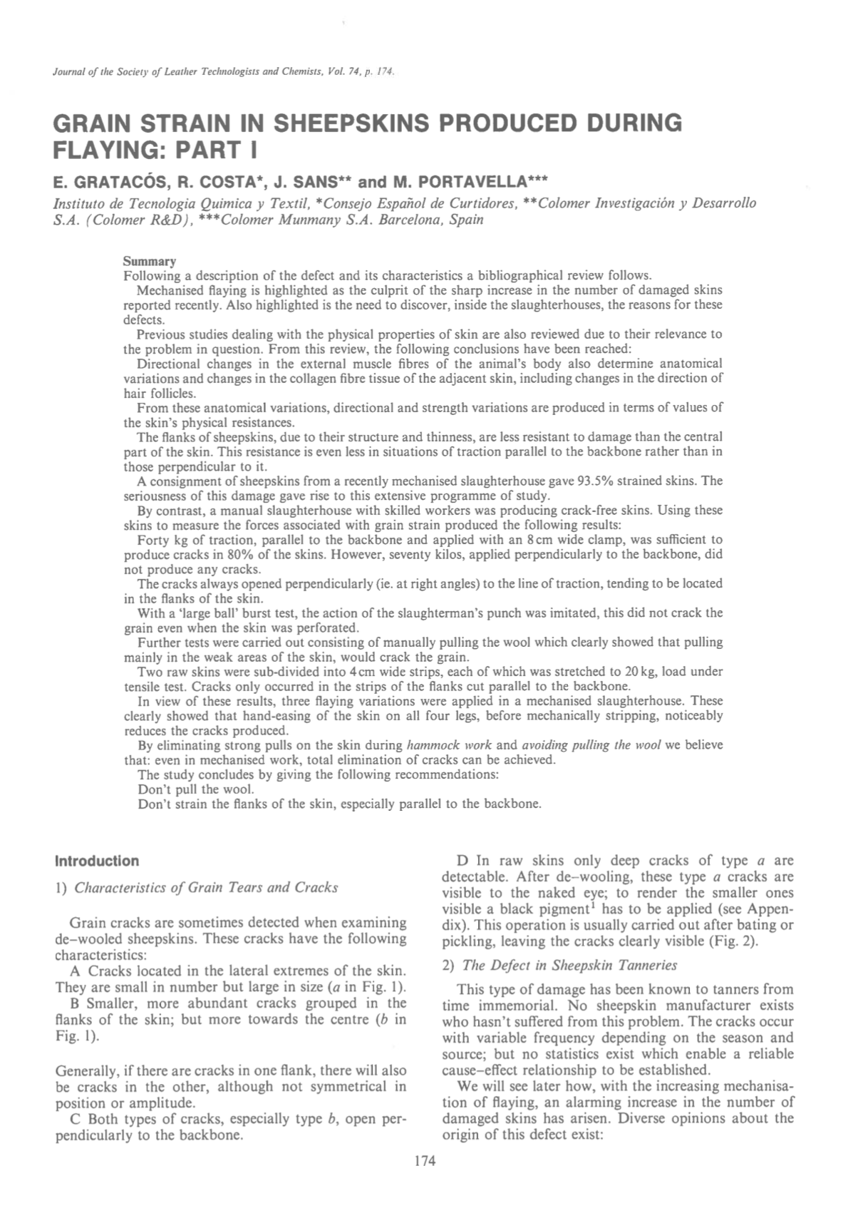 Following a description of the defect and its characteristics a bibliographical review follows. Mechanised flaying is highlighted as the culprit of the sharp increase in the number of damaged skins reported recently. Also highlighted is the need to discover, inside the slaughterhouses, the reasons for these defects. Previous studies dealing with the physical properties of skin are also reviewed due to their relevance to the problem in question. From this review, the following conclusions have been reached: Directional changes in the external muscle fibres of the animal’s body also determine anatomical variations and changes in the collagen fibre tissue of the adjacent skin, including changes in the direction of hair follicles. From these anatomical variations, directional and strength variations are produced in terms of values of the skin’s physical resistances. The flanks of sheepskins, due to their structure and thinness, are less resistant to damage than the central part of the skin. This resistance is even less in situations of traction parallel to the backbone rather than in those perpendicular to it. A consignment of sheepskins from a recently mechanised slaughterhouse gave 93.5% strained skins. The seriousness of this damage gave rise to this extensive programme of study. By contrast, a manual slaughterhouse with skilled workers was producing crack-free skins. Using these skins to measure the forces associated with grain strain produced the following results: Forty kg of traction, parallel to the backbone and applied with an 8 cm wide clamp, was sufficient to produce cracks in 80% of the skins. However, seventy kilos, applied perpendicularly to the backbone, did not produce any cracks. The cracks always opened perpendicularly (i.e. at right angles) to the line of traction, tending to be located in the flanks of the skin. With a ‘large ball’ burst test, the action of the slaughterman’s punch was imitated, this did not crack the grain even when the skin was perforated. Further tests were carried out consisting of manually pulling the wool which clearly showed that pulling mainly in the weak areas of the skin, would crack the grain. Two raw skins were sub-divided into 4 cm wide strips, each of which was stretched to 20 kg, load under tensile test. Cracks only occurred in the strips of the flanks cut parallel to the backbone. In view of these results, three flaying variations were applied in a mechanised slaughterhouse. These clearly showed that hand-easing of the skin on all four legs, before mechanically stripping, noticeably reduces the cracks produced. By eliminating strong pulls on the skin during hammock work and avoiding pulling the wool we believe that: even in mechanised work, total elimination of cracks can be achieved. The study concludes by giving the following recommendations: Don’t pull the wool. Don’t strain the flanks of the skin, especially parallel to the backbone.