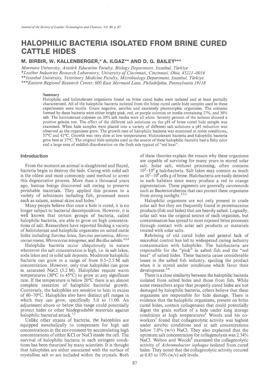 Halophilic and halotolerant organisms found on brine cured hides were isolated and at least partially characterized. All of the halophilic bacteria isolated from the brine cured cattle hide samples used in these experiments were motile. Gram negative, aerobic and extremely pleomorphic organisms. The colonies formed by these bacteria were either bright pink, red, or purple colonies on media containing 27%, and 30% salt. The halotolerant colonies on 20% salt media were all white. Seventy percent of the isolates showed a positive gelatin test. The effect of the different salt solutions on the pH of brine cured hide sample was examined. When hide samples were placed into a variety of different salt solutions a pH reduction was observed as the organisms grew. The growth rate of halophilic bacteria was examined at room conditions, 37°C and 41°C. Growth was very slow at low temperatures. Halotolerant bacteria and halophilic bacteria grew best at 37°C. The original hide samples used as the source of these halophilic bacteria had a fishy odor and a large area of reddish discoloration on the flesh side typical of “red heat”.