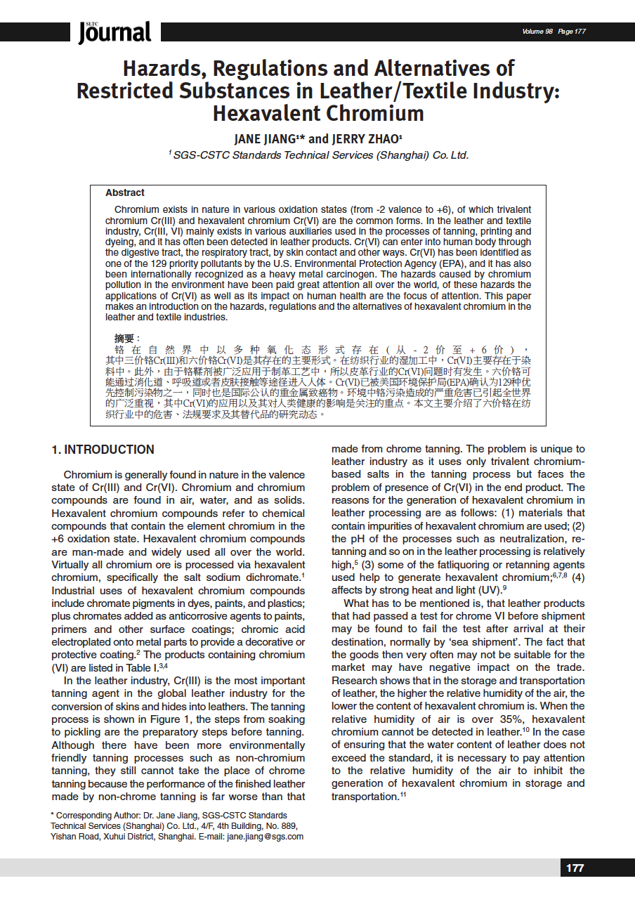 Chromium exists in nature in various oxidation states (from -2 valence to +6), of which trivalent chromium Cr(III) and hexavalent chromium Cr(VI) are the common forms. In the leather and textile industry, Cr(III, VI) mainly exists in various auxiliaries used in the processes of tanning, printing and dyeing, and it has often been detected in leather products. Cr(VI) can enter into human body through the digestive tract, the respiratory tract, by skin contact and other ways. Cr(VI) has been identified as one of the 129 priority pollutants by the U.S. Environmental Protection Agency (EPA), and it has also been internationally recognized as a heavy metal carcinogen. The hazards caused by chromium pollution in the environment have been paid great attention all over the world, of these hazards the applications of Cr(VI) as well as its impact on human health are the focus of attention. This paper makes an introduction on the hazards, regulations and the alternatives of hexavalent chromium in the leather and textile industries.