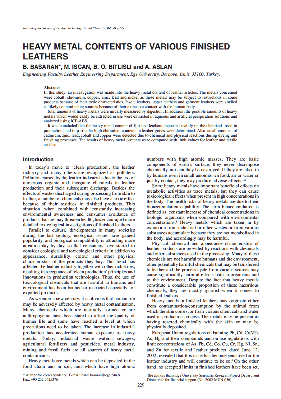 In this study, an investigation was made into the heavy metal content of leather articles. The metals concerned were cobalt, chromium, copper, zinc, lead and nickel as these metals may be subject to restrictions in some products because of their toxic characteristics. Insole leathers, upper leathers and garment leathers were studied as likely contaminating sources because of their extensive contact with the human body.