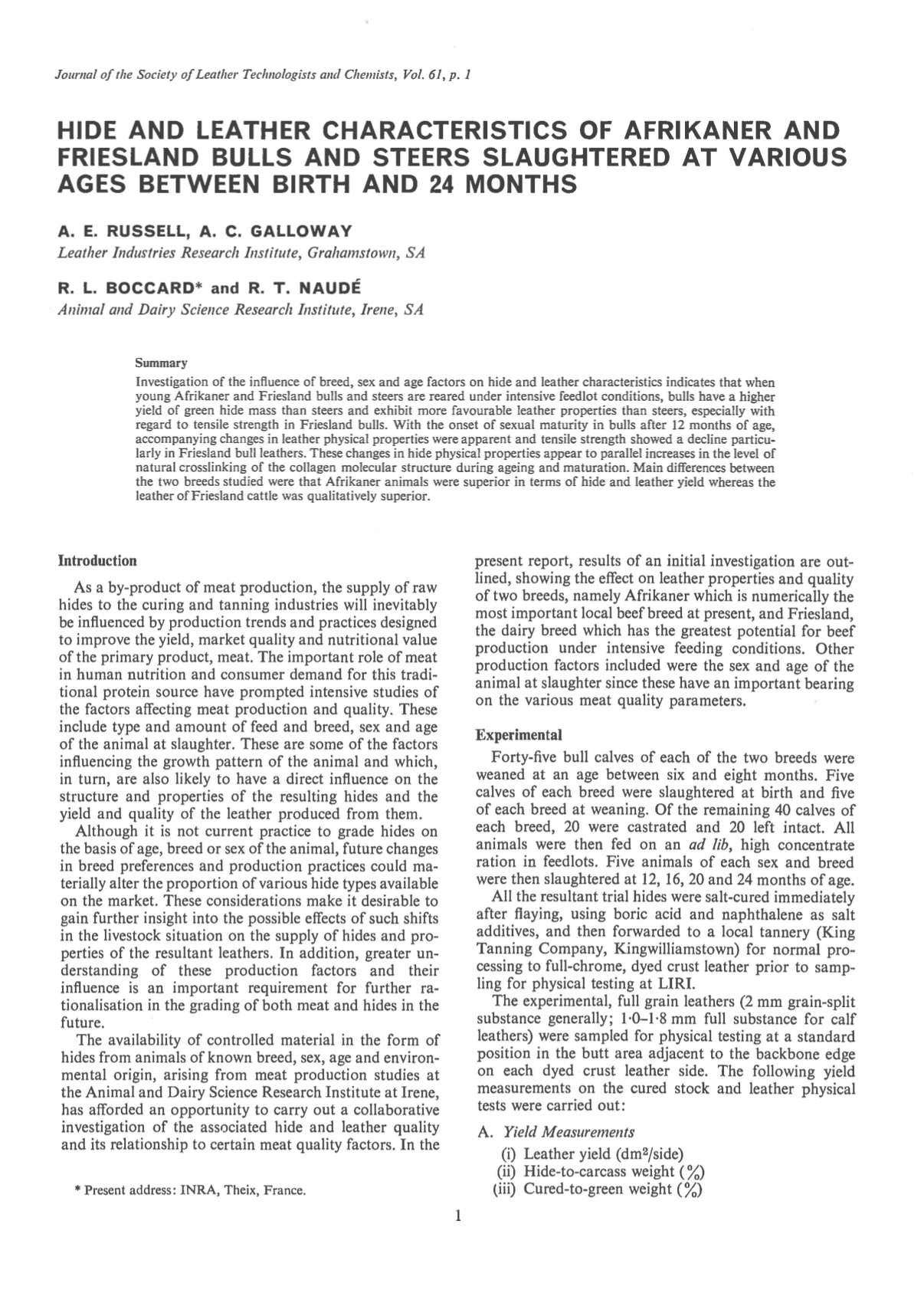 Investigation of the influence of breed, sex and age factors on hide and leather characteristics indicates that when young Afrikaner and Friesland bulls and steers are reared under intensive feedlot conditions, bulls have a higher yield of green hide mass than steers and exhibit more favourable leather properties than steers, especially with regard to tensile strength in Friesland bulls. With the onset of sexual maturity in bulls after 12 months of age, accompanying changes in leather physical properties were apparent and tensile strength showed a decline particularly in Friesland bull leathers. These changes in hide physical properties appear to parallel increases in the level of natural crosslinking of the collagen molecular structure during ageing and maturation. Main differences between the two breeds studied were that Afrikaner animals were superior in terms of hide and leather yield whereas the leather of Friesland cattle was qualitatively superior.