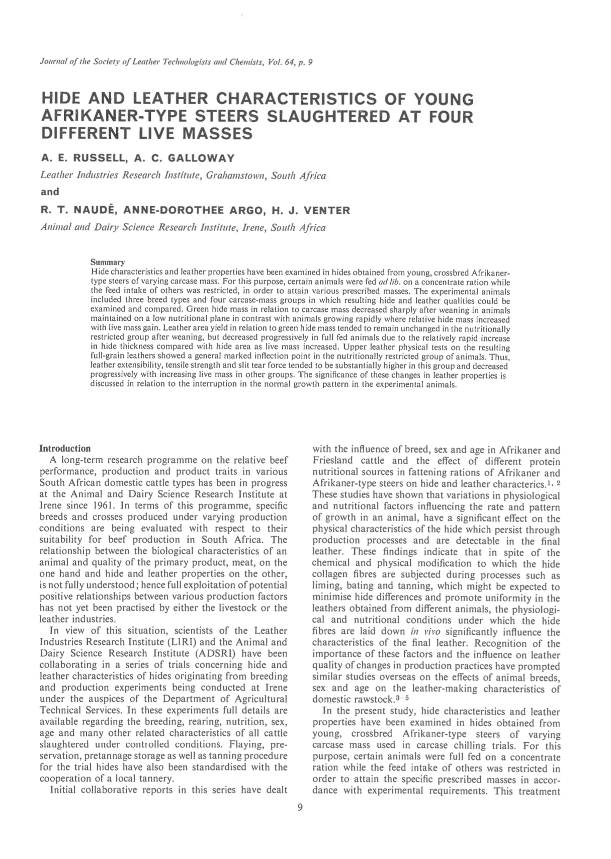 Hide characteristics and leather properties have been examined in hides obtained from young, crossbred Afrikaner type steers of varying carcase mass. For this purpose, certain animals were fed ad lib. on a concentrate ration while the feed intake of others was restricted, in order to attain various prescribed masses. The experimental animals included three breed types and four carcase-mass groups in which resulting hide and leather qualities could be examined and compared. Green hide mass in relation to carcase mass decreased sharply after weaning in animals maintained on a low nutritional plane in contrast with animals growing rapidly where relative hide mass increased with live mass gain. Leather area yield in relation to green hide mass tended to remain unchanged in the nutritionally restricted group after weaning, but decreased progressively in full fed animals due to the relatively rapid increase in hide thickness compared with hide area as live mass increased. Upper leather physical tests on the resulting full-grain leathers showed a general marked inflection point in the nutritionally restricted group of animals. Thus, leather extensibility, tensile strength and slit tear force tended to be substantially higher in this group and decreased progressively with increasing live mass in other groups. The significance of these changes in leather properties is discussed in relation to the interruption in the normal growth pattern in the experimental animals.