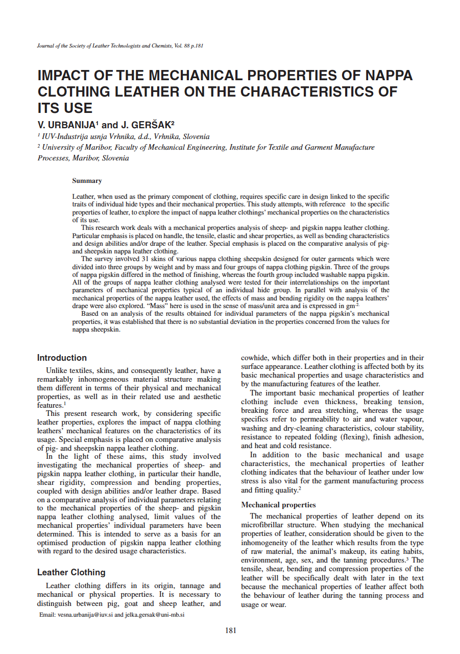 This research work deals with a mechanical properties analysis of sheep- and pigskin nappa leather clothing. Particular emphasis is placed on handle, the tensile, elastic and shear properties, as well as bending characteristics and design abilities and/or drape of the leather. Special emphasis is placed on the comparative analysis of pigand sheepskin nappa leather clothing.