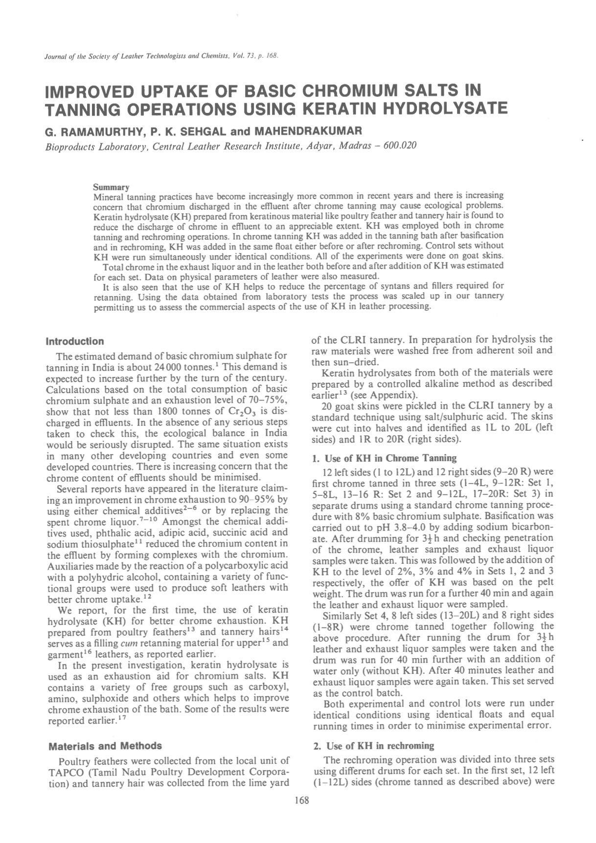 Mineral tanning practices have become increasingly more common in recent years and there is increasing concern that chromium discharged in the effluent after chrome tanning may cause ecological problems. Keratin hydrolysate (KH) prepared from keratinous material like poultry feather and tannery hair is found to reduce the discharge of chrome in effluent to an appreciable extent. KH was employed both in chrome tanning and rechroming operations. In chrome tanning KH was added in the tanning bath after basification and in rechroming, KH was added in the same float either before or after rechroming. Control sets without KH were run simultaneously under identical conditions. All of the experiments were done on goat skins. Total chrome in the exhaust liquor and in the leather both before and after addition of KH was estimated for each set. Data on physical parameters of leather were also measured. It is also seen that the use of KH helps to reduce the percentage of syntans and fillers required for retanning. Using the data obtained from laboratory tests the process was scaled up in our tannery permitting us to assess the commercial aspects of the use of KH in leather processing.