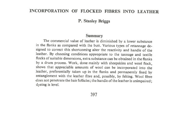The commercial value of leather is diminished by a lower substance in the flanks as compared with the butt. Various types of retannage de signed to correct this shortcoming alter the reactivity and handle of the leather. By choosing conditions appropriate to the tannage and textile flocks of suitable dimensions, extra substance can be obtained in the flanks by a drum process. Work, done mainly with sheepskins and wool flock, shows that appreciable amounts of wool can be incorporated into the leather, preferentially taken up in the flanks and permanently fixed by entanglement with the leather fibre and, possibly, by felting. Wool fibre does not penetrate the hair follicles; the handle of the leather is unimpaired; dyeing is level