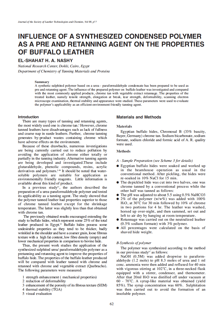 Asynthetic sulphited polymer based on a urea – paraformaldehyde condensate has been prepared to be used as pre and retanning agent. The influence of the prepared polymer on buffalo leather was investigated and compared with the most commonly applied products, chrome tan with vegetable extract retannage. The properties of the treated leather, namely tensile strength, elongation at break, tear strength, deformability, scanning electron microscope examination, thermal stability and appearance were studied. These parameters were used to evaluate the polymer’s applicability as an efficient environment friendly tanning agent.