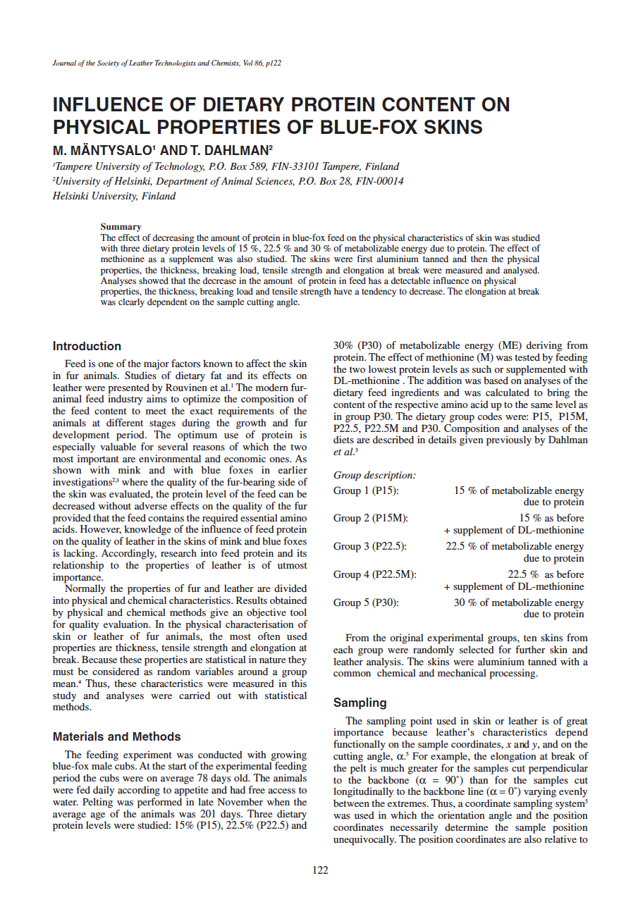 The effect of decreasing the amount of protein in blue-fox feed on the physical characteristics of skin was studied with three dietary protein levels of 15 %, 22.5 % and 30 % of metabolizable energy due to protein. The effect of methionine as a supplement was also studied. The skins were first aluminium tanned and then the physical properties, the thickness, breaking load, tensile strength and elongation at break were measured and analysed. Analyses showed that the decrease in the amount of protein in feed has a detectable influence on physical properties, the thickness, breaking load and tensile strength have a tendency to decrease. The elongation at break was clearly dependent on the sample cutting angle.