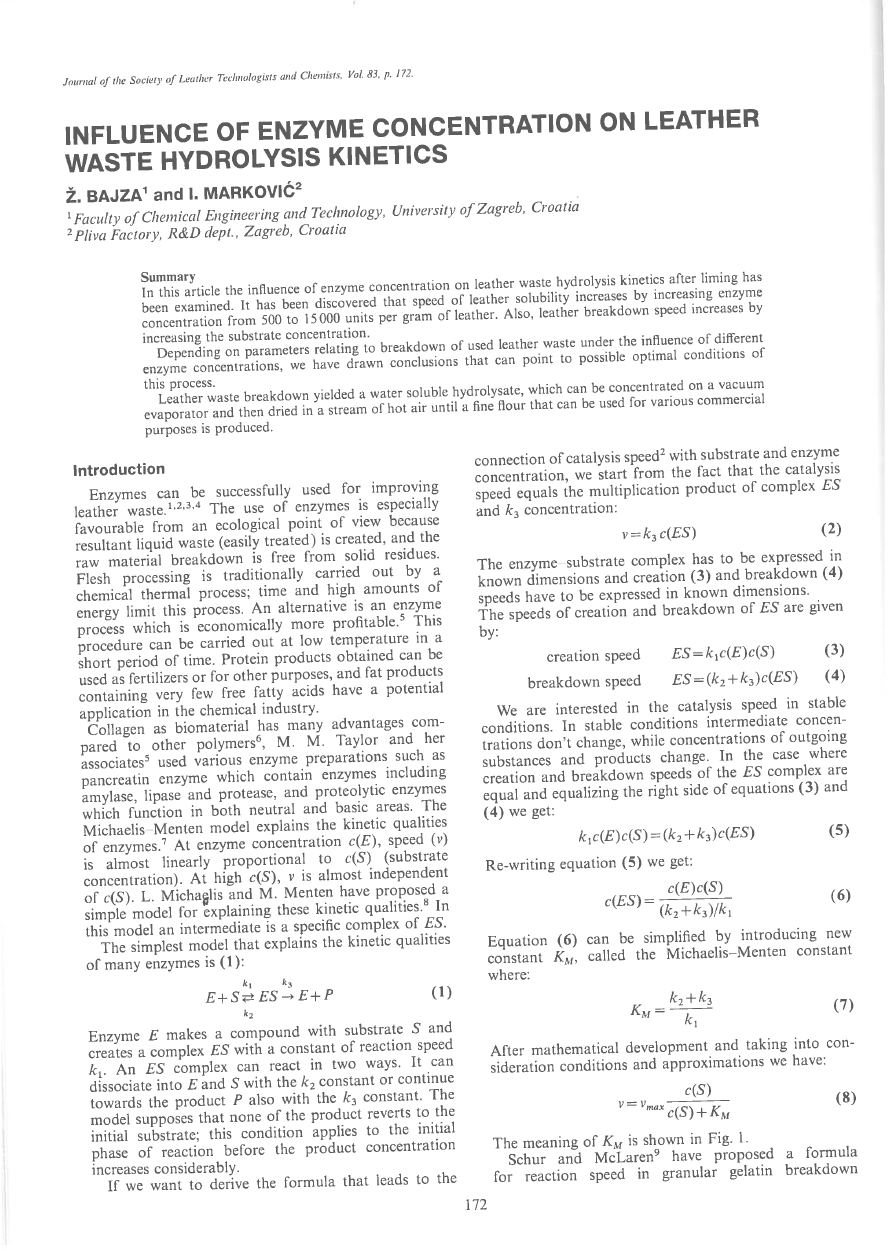 In this article the influence of enzyme concentration on leather waste hydrolysis kinetics after liming has been examined. It has been discovered that speed of leather solubility increases by increasing enzyme concentration from 500 to 15000 units per gram of leather. Also, leather breakdown speed increases by increasing the substrate concentration.